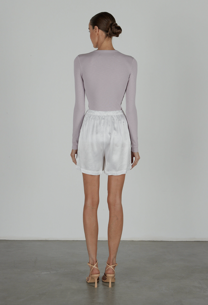 100% rayon. Made in USA. Hand wash. Elastic waistband. Side slant pockets. Satin fabric.