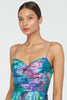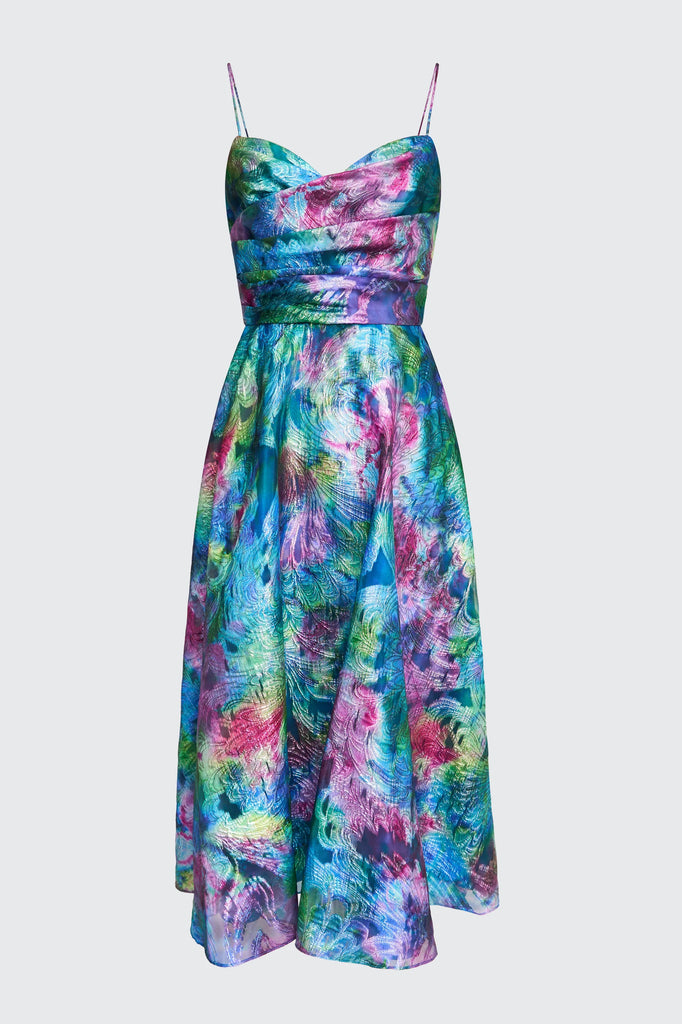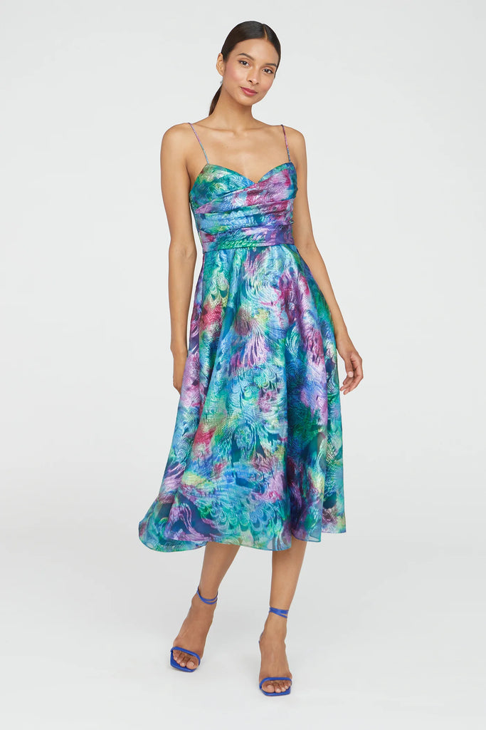 The Allegra Dress is a vibrant printed fil coupé A-line cocktail dress with a draped bodice and slender spaghetti straps. Featuring Spring's abstract Aquatic Blooms print, this eye-catching design is perfect for garden parties, summer soirées, and cocktail occasions.
