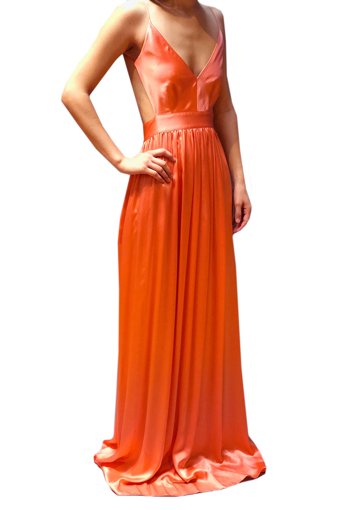 This beautiful silk charmuese dress has a stunning neckline with an open back.