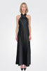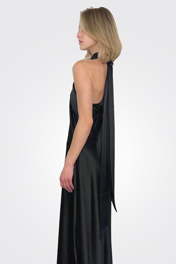 The Cropped Pandora Dress is defined by its asymmetric halter neckline and bias cut which is mirrored in the grain of the satin fabrication and extends to an elegant cropped hemline.