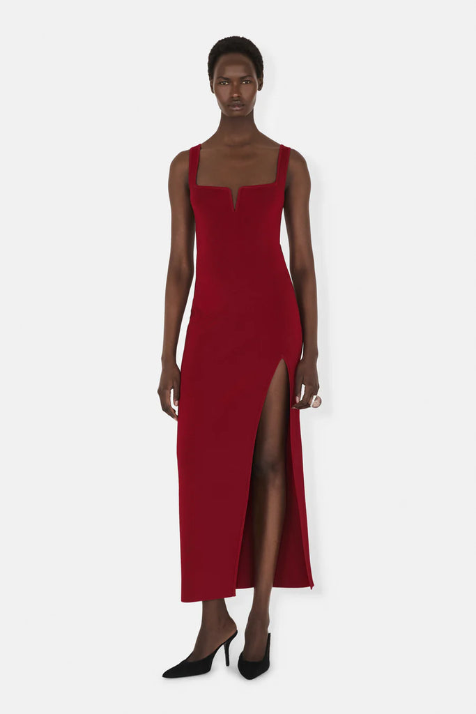 Featuring Galvan’s signature neckline, the Freya dress is made from a body-hugging ribbed knit that supports as it sculpts.