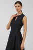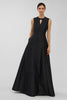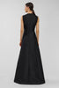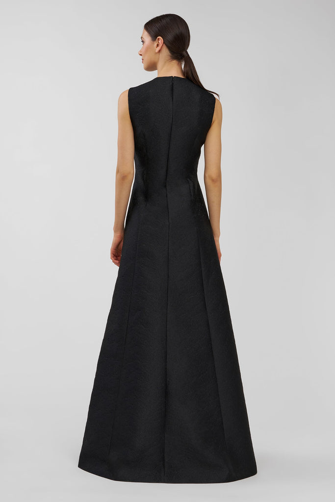 Crafted from textured jacquard, this sleek black gown features a sculpted bodice with a keyhole detail and soft flares through the skirt—a modern take for black-tie events or formal dinners.