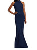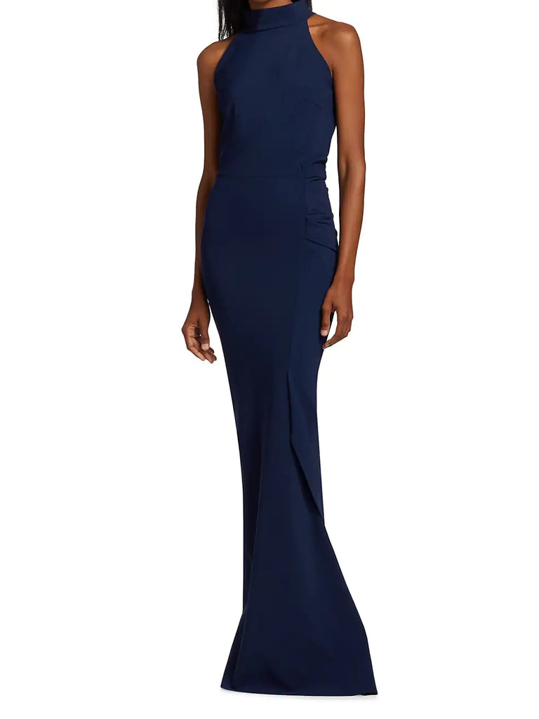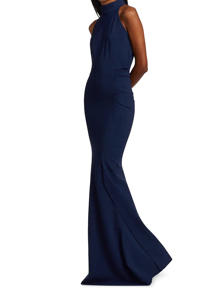 Chiara Boni La Petite Robe's Gudrum gown fits and flares from the mock halterneck to the flared hem. Crafted of stretchy fabric, this floor-length piece is detailed with dramatic ruffles on the side.