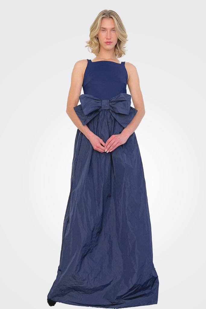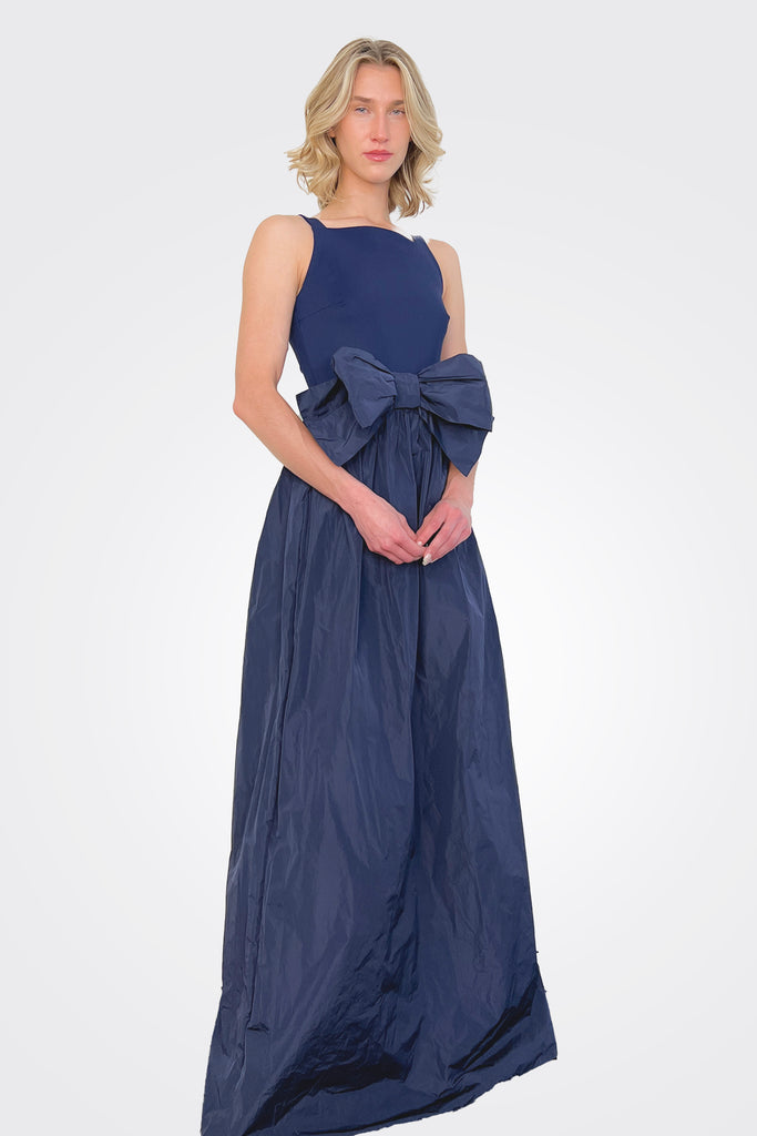 The Harlee dress from Chiara Boni La Petite showcases a stunning large bow detail and a luxurious taffeta skirt.