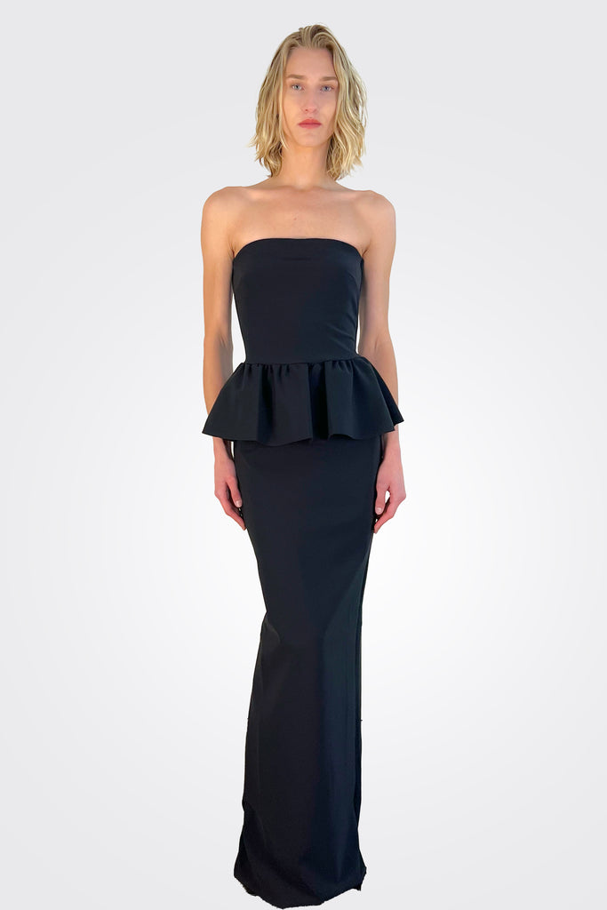 Fashioned with a pencil skirt, the Panthea gown from Chiara Boni La Petite Robe flaunts a peplum accent at the waist.