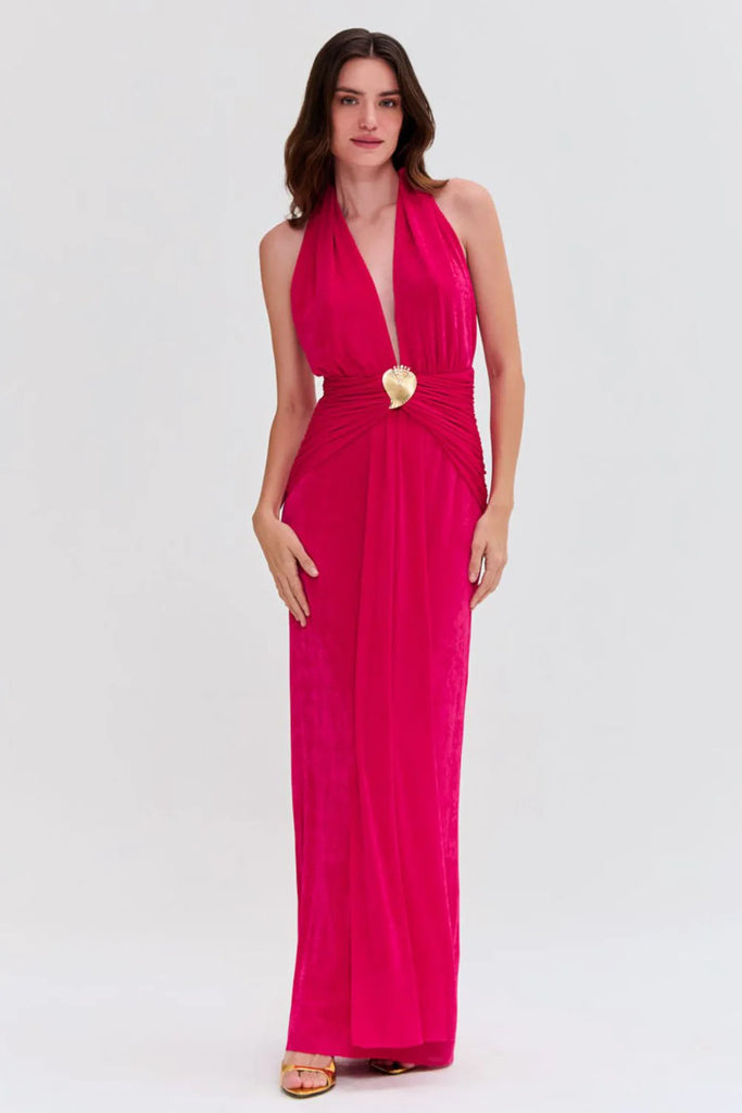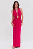 This gown features a plunging halter neckline with ruching detail along the waistline and center special hardware into a flowy full length skirt. Open back design with a tie at the neck and concealed zipper closure.