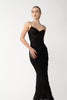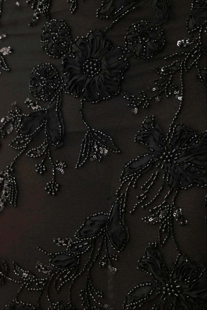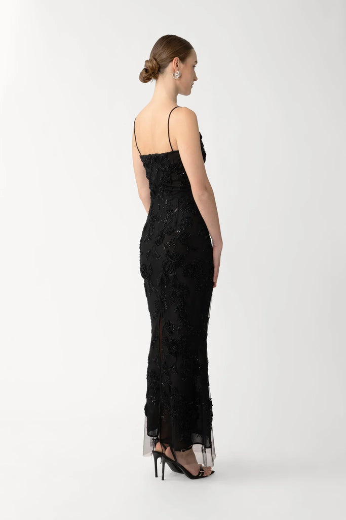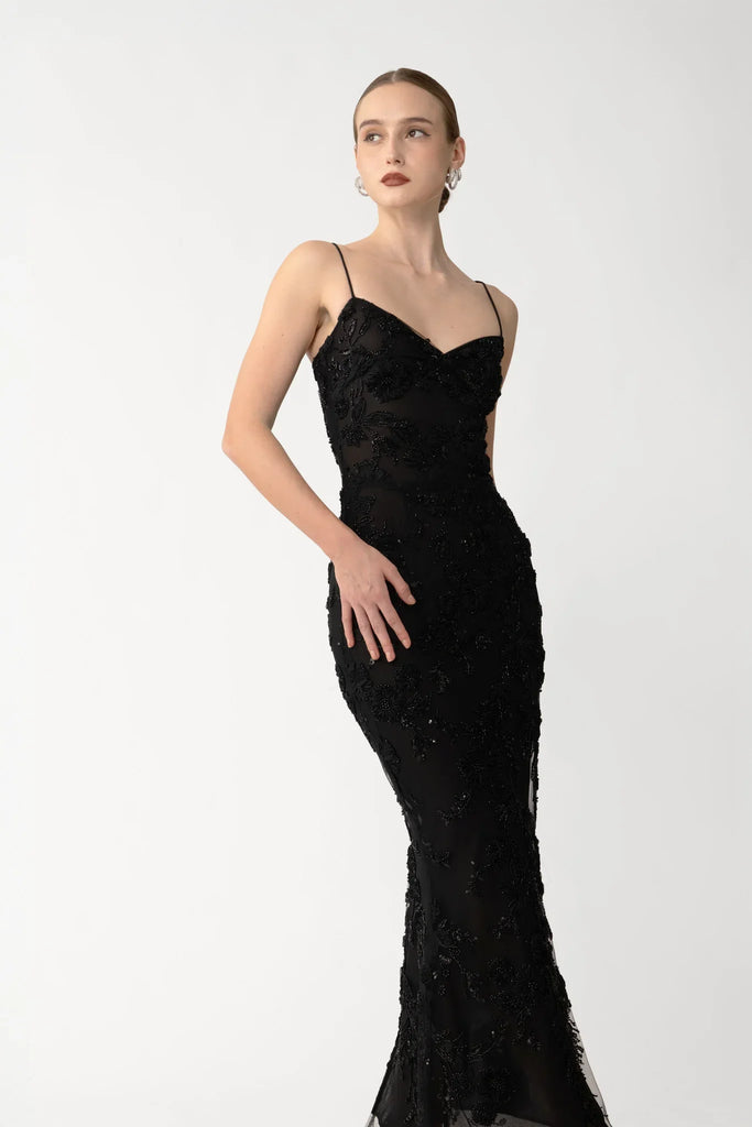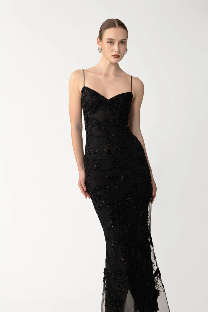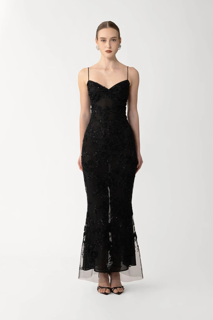 The Sammie Dress is crafted from sheer black mesh and embellished with tonal floral sequins. Featuring thin straps and a subtle mermaid fit, its a standout choice for cocktail hour.