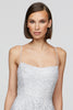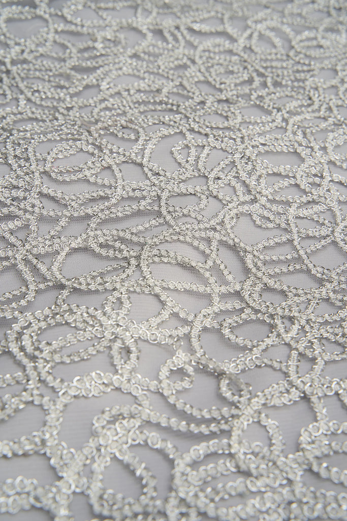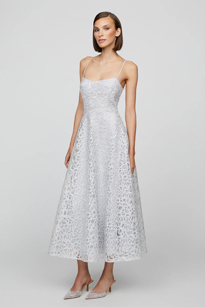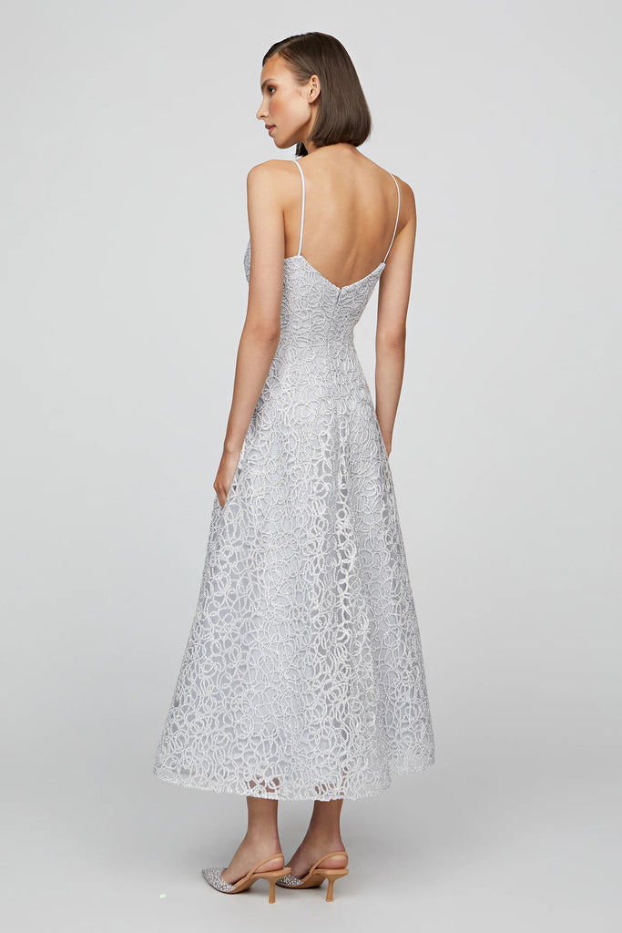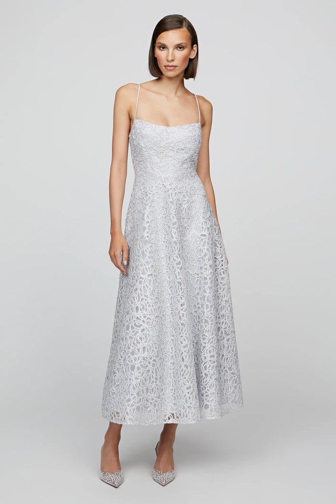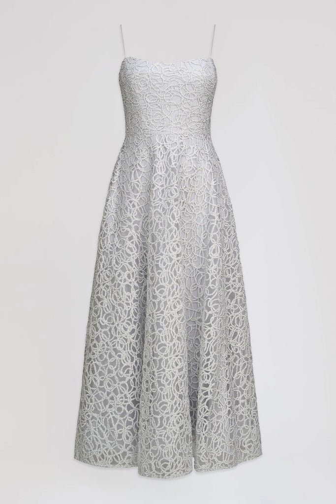 This cocktail dress features swirling abstract embroidery woven from metallic cording that dances across a sheer tulle base. The intricate metallic threads add a subtle sheen, making this a perfect choice for those who seek a modern piece with an effortless touch of glamour.