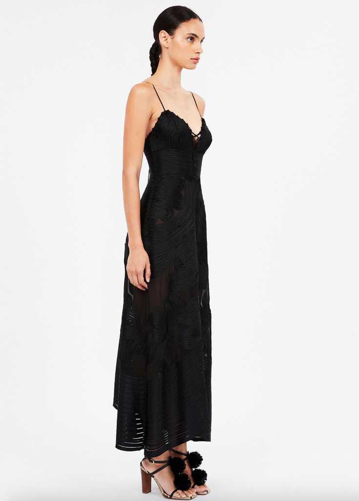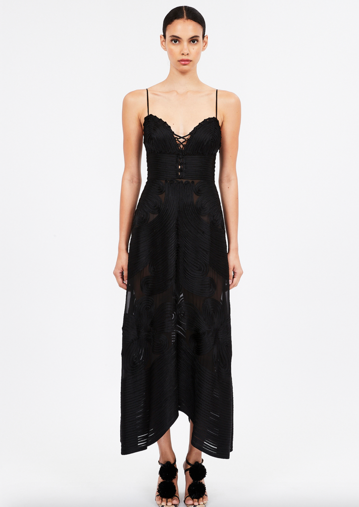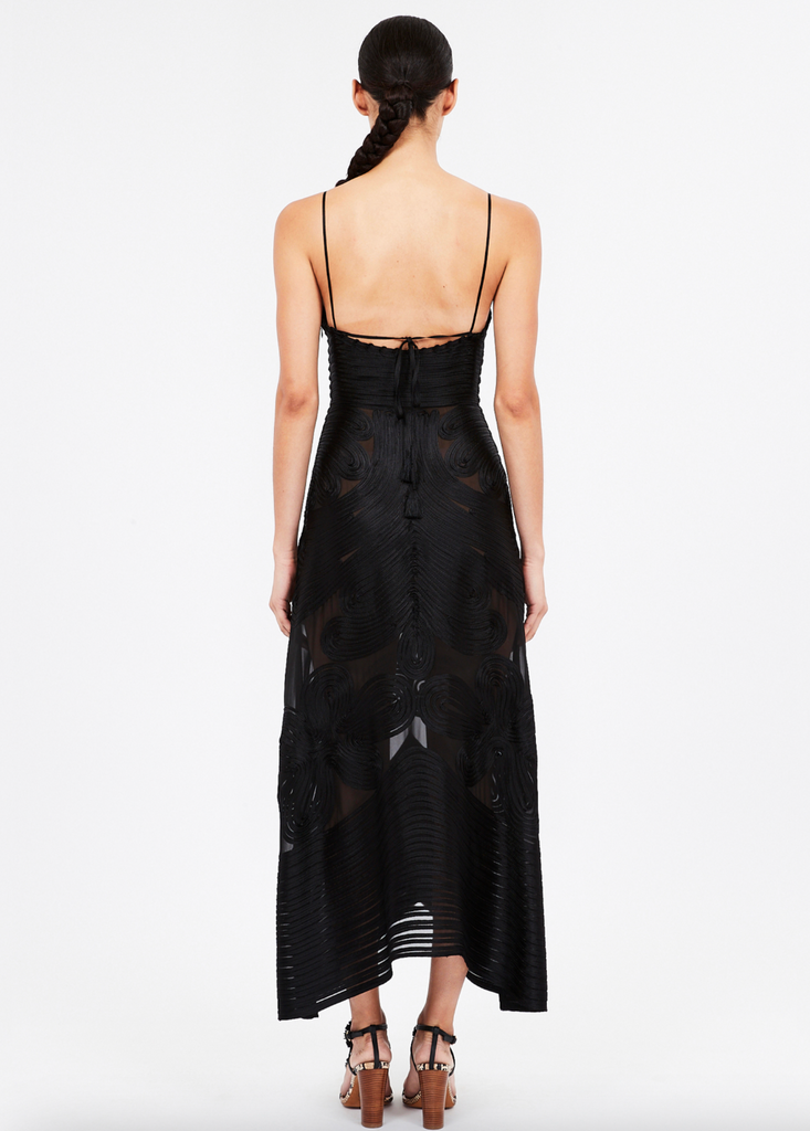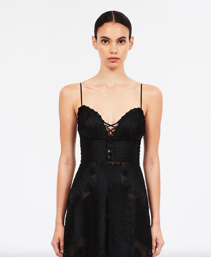 A stunning display of craft, the Vesna Dress skims the form in a weightless chiffon silhouette that’s entirely embroidered with undulating satin ribbons. Look 40 on our SS25 runway, this ornate midi-length frock has delicate straps, a V-neckline with lace-up ties that fasten in the back, and is an ethereal peony pink. It fastens with a zipper tucked away at the side.