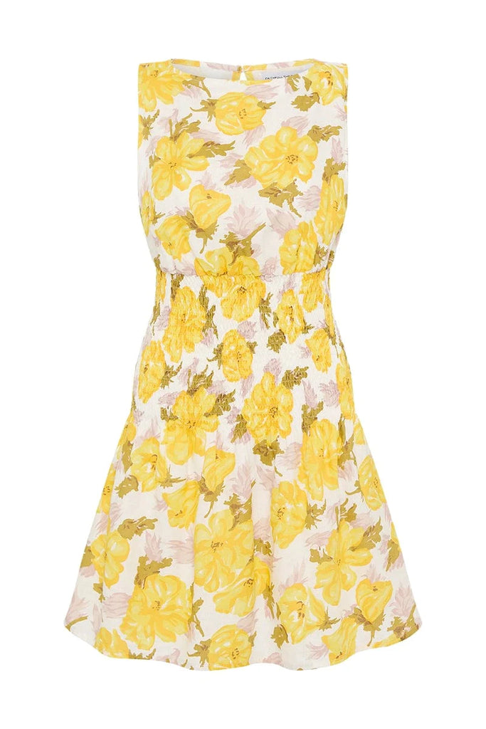 In responsibly sourced European Flax® linen, the Novalee Mini Dress in Isadora Floral features a feminine, sleeveless design with a boat neckline and blouson bodice. The waist is fully shirred for ease of fit and gives way to a airy, gathered skirt that falls to a playful mini length. Designed for sunshine dressing, the Novalee is patterned with a yellow floral motif for a vibrant finish.