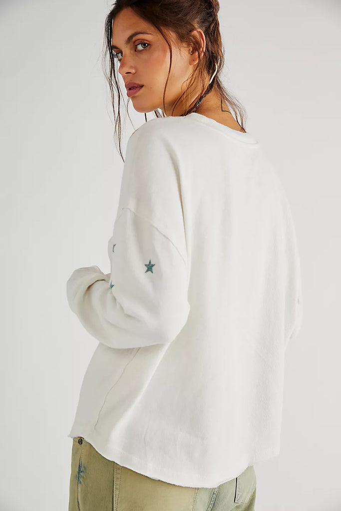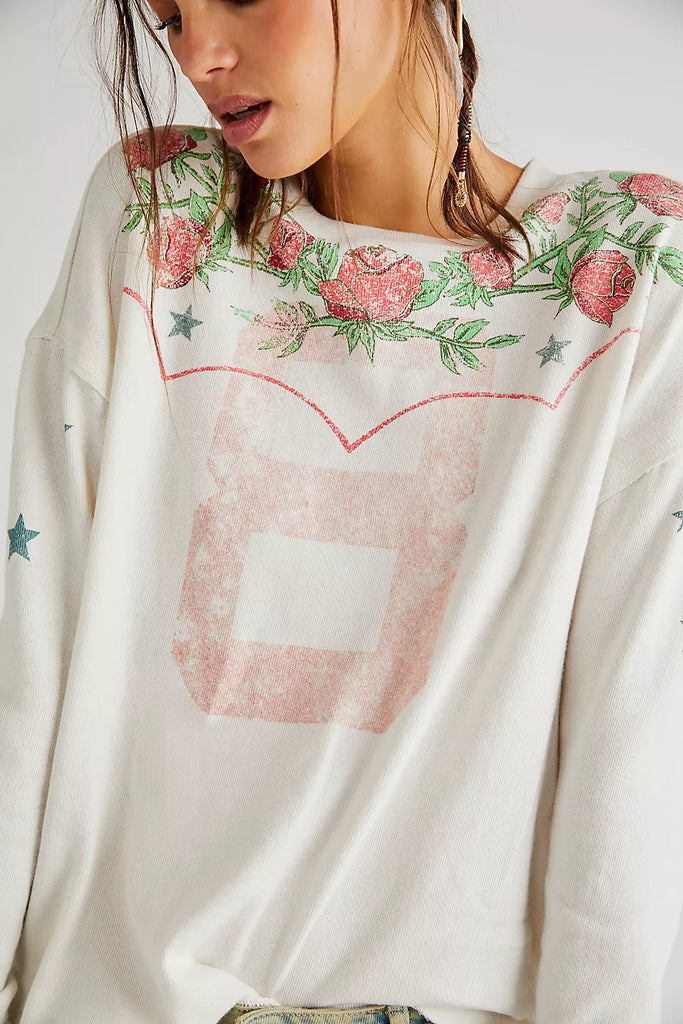 Features: Varsity-inspired graphics, floral pattern at the neckline, vintage-inspired wash