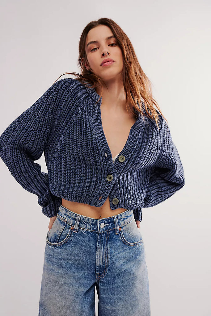 Sure to be a staple in your sweaters collection for many years to come, this totally timeless cardigan is featured in a slouchy, cropped fit with button-front closure and defined knit detailing throughout for added dimension.