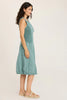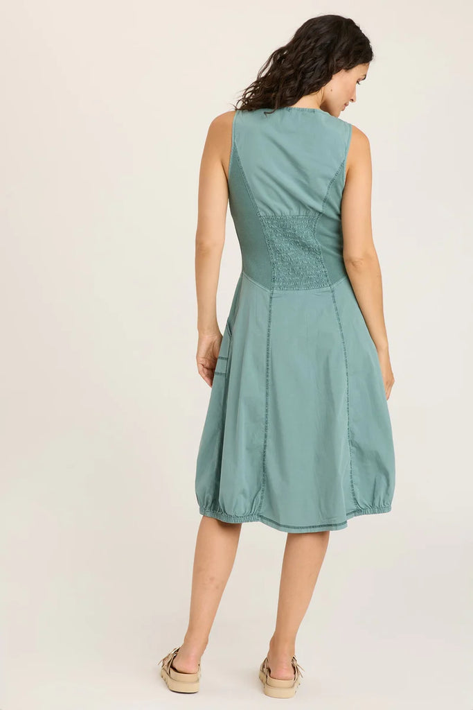 A sleeveless, v-neck midi dress with a bubble skirt, shirring details at front and back, princess line jersey panels for impeccable fit, and two front pockets trimmed with grommets.