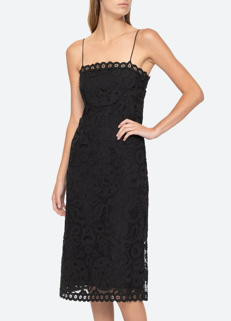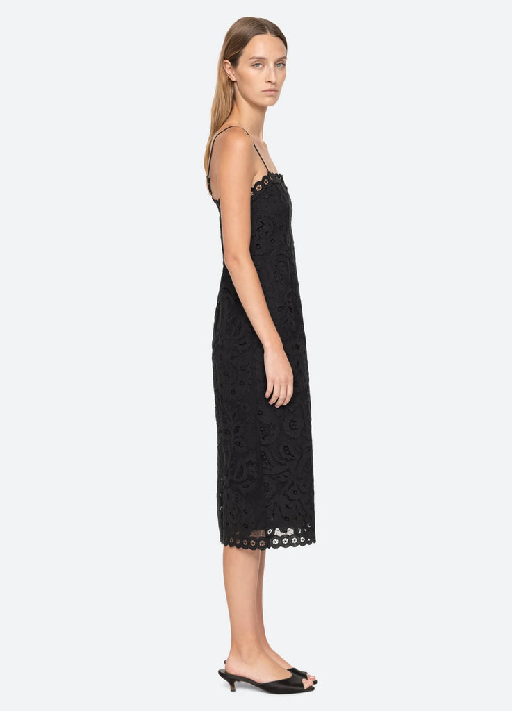The Lovina embroidered lace slip dress features embroidered lace detailing, eyelet trim and midi silhouette.