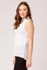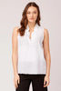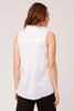A sleeveless top with a mock high collar and a v-neck placket are accented by brass eyelets and ruffles. This silhouette has a high-low raw-edge hemline, and shirt pleats at back yoke.