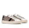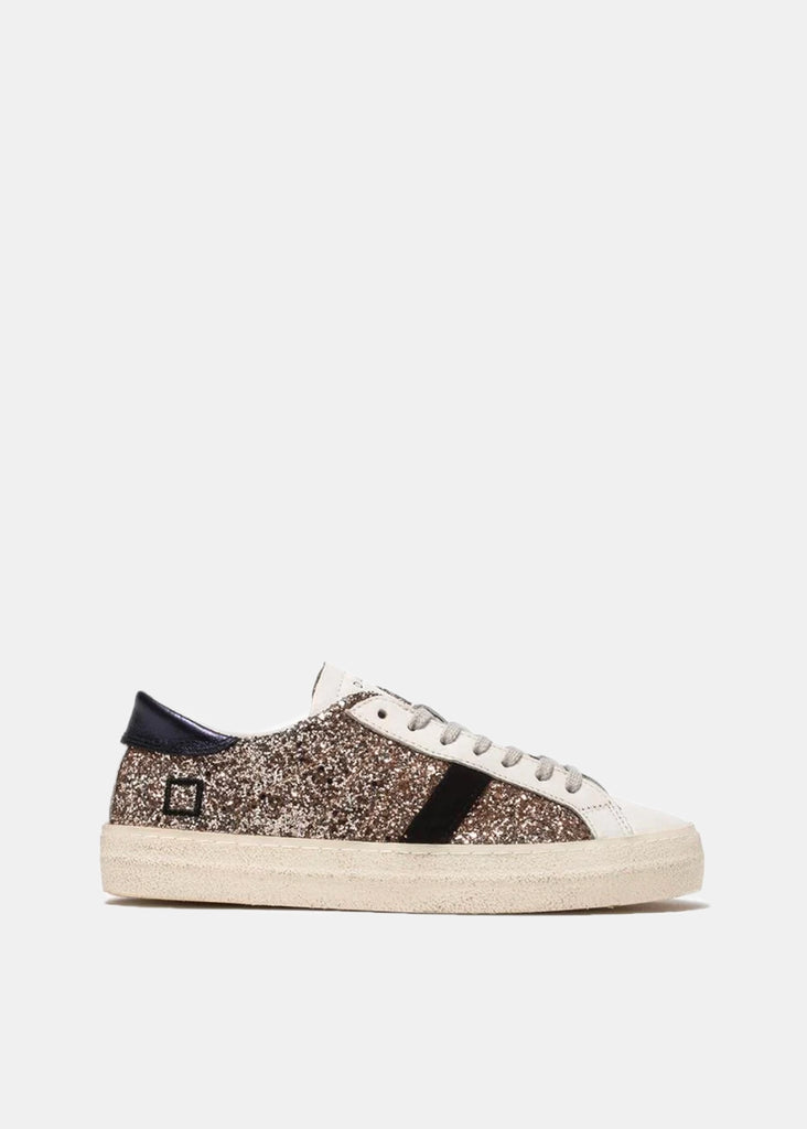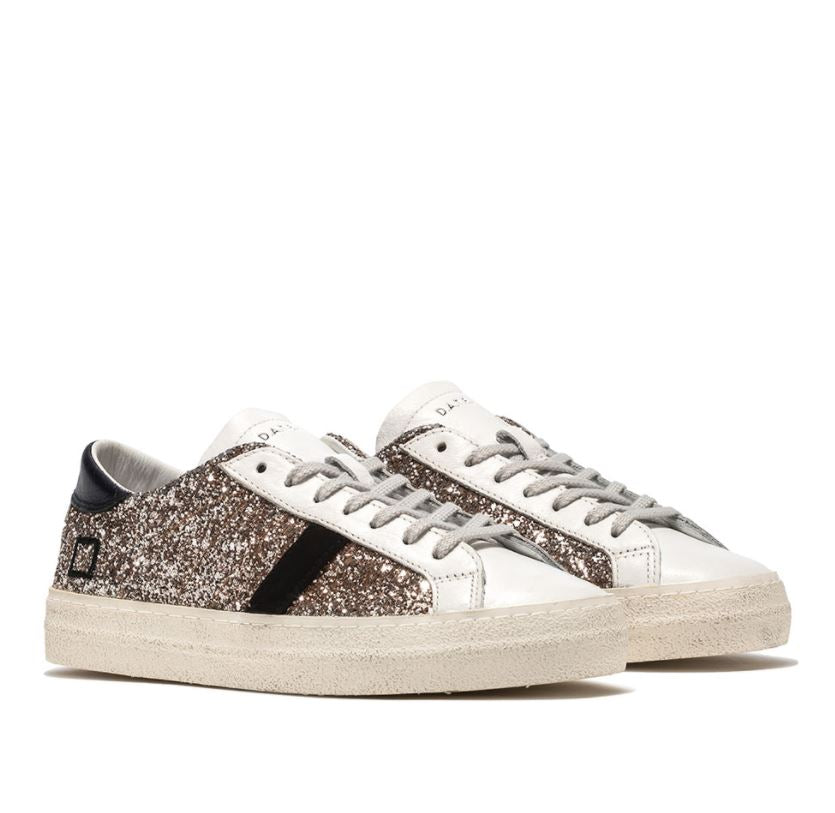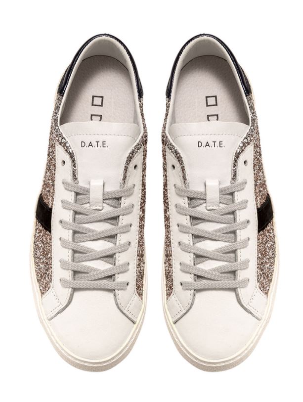 Taupe gray glitter-finish leather low-top Sneakers. The toe and tongue, which features a D.A.T.E. etched lettering, come in white leather. Cotton laces and square logo embroidery at side. Black nubuck leather side stripe. Blue laminated leather back patch. Leather and cotton terry lining. The 2.5 cm-high raised insole allows for optimal comfort. 2.5 cm-high seamed sole in slightly stained, used-effect, concrete-texture rubber. All fabrics and hides used are Made in Italy.