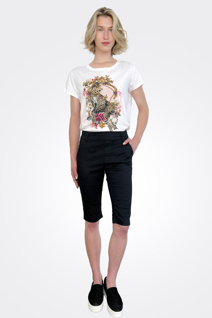 Dafna style Bermuda with belt loops . Black Print. 98% cotton 2% Lycra. Machine washable. Does not Wrinkle or Fade. Comfortable, Stylish, Very Flattering. Wear with Sneakers, Sandals, Booties, Heels. Wear it Casual or Dressy for Evening. Try them and you will see why these pants have been the #1 selling item in boutiques all around the U.S.