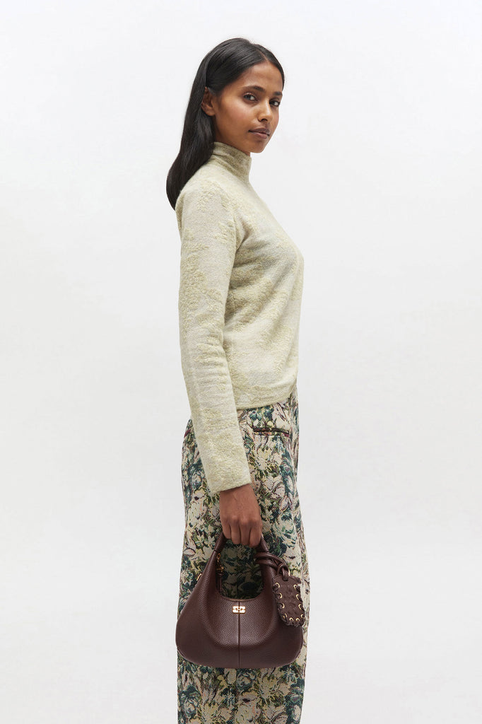 This bag features a top handle, adjustable and removable strap and a zipper closing. The bag has a mirror hangtag and an internal pocket.