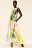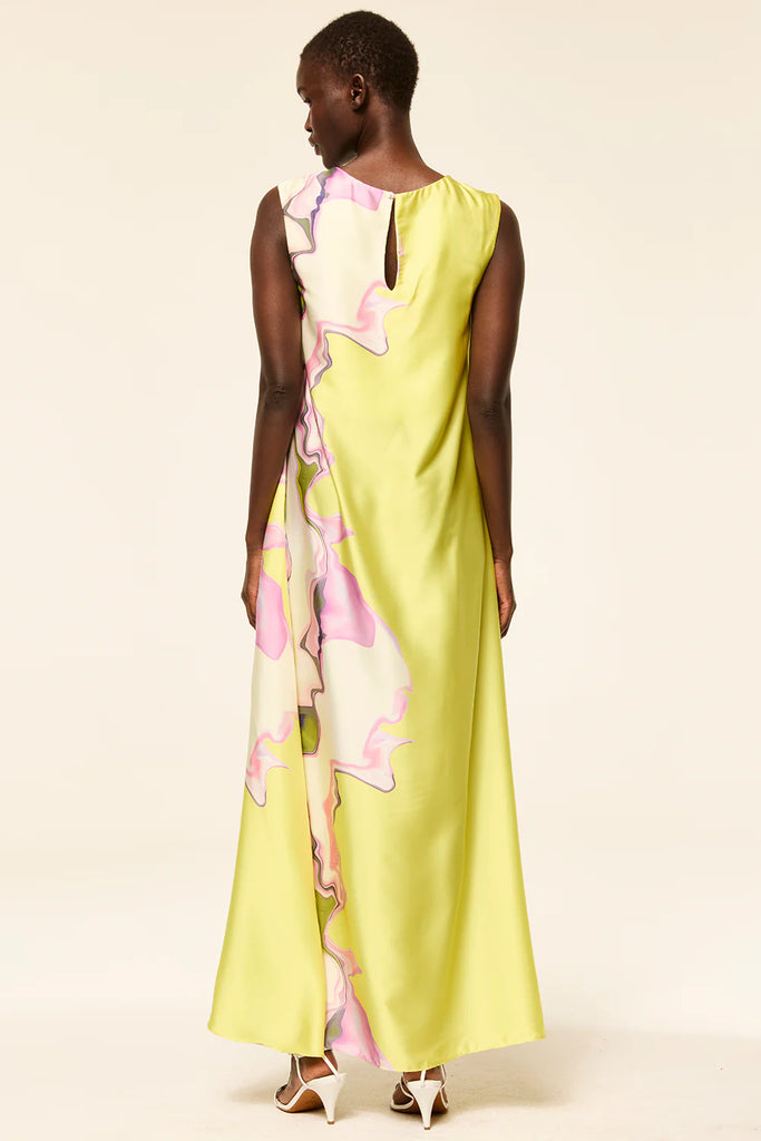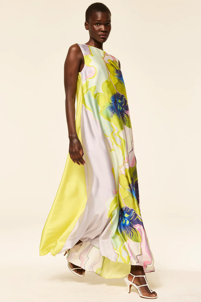 Sylvie dress is all things spring in a vibrant Marble Flora satin with a solid chartreuse back. This modern, flowing, sleeveless maxi dress features a high neckline with keyhole button-back closure. Pair with a simple heel or flat for a look that will carry you through the spring season and beyond.