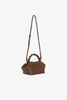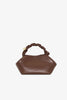 This bag features a tone-on-tone metallic GANNI Butterfly logo, a twisted handle with a braided knot, and a gold-tone metallic dice with a GANNI Butterfly logo engraved. The bag has an internal magnetic closure, a flat card pocket inside, and an adjustable and removable shoulder strap for crossbody wear.