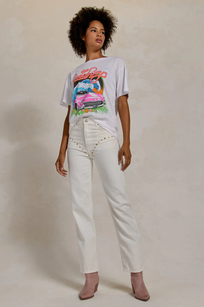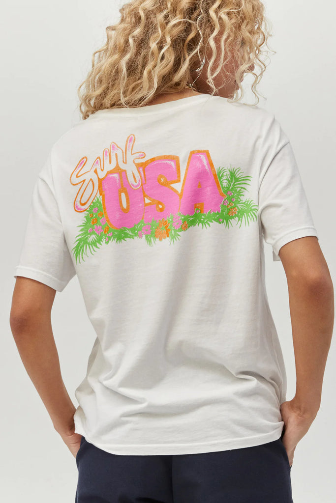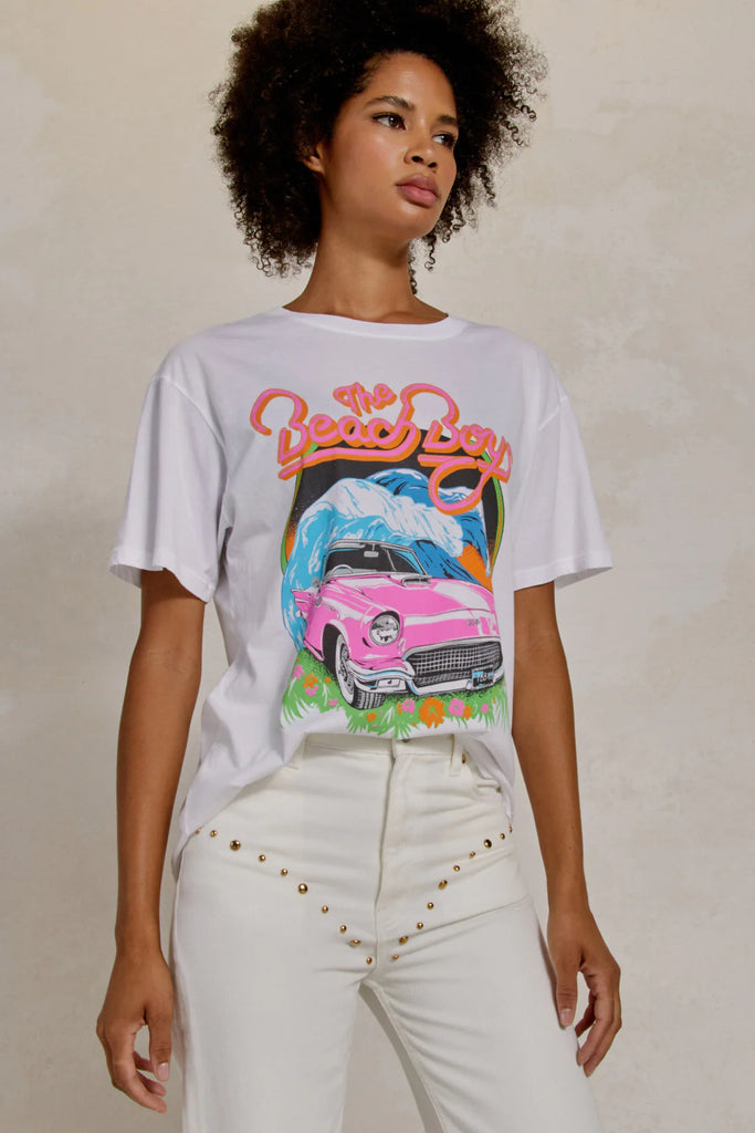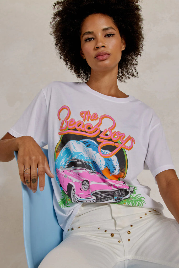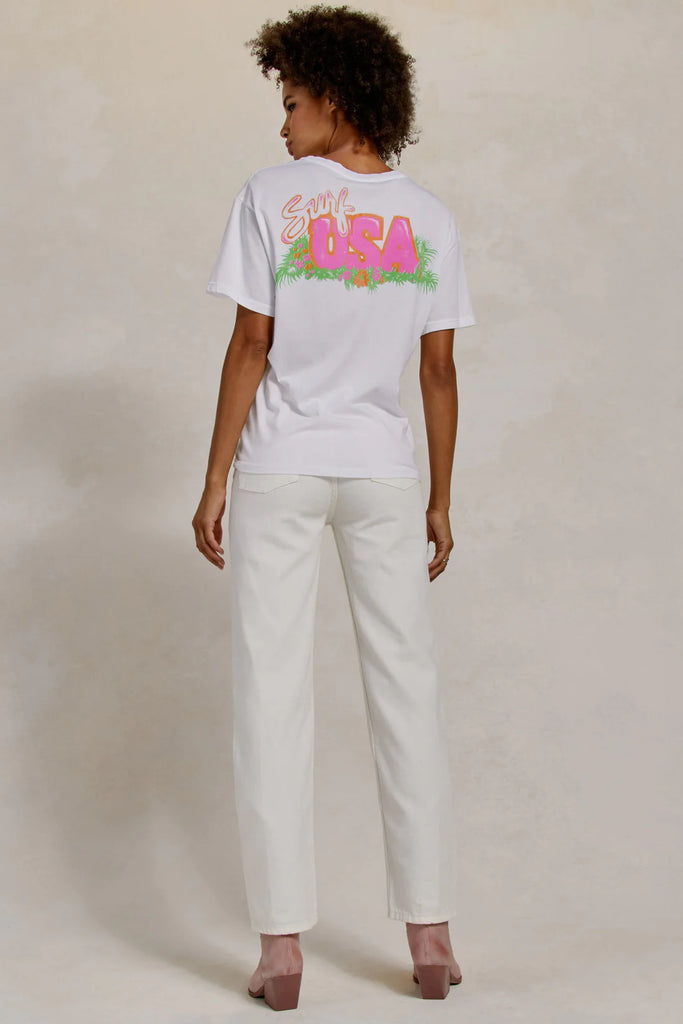 Coastal culture & California sound. Cue, The Beach Boys. Synonymous with surfing, cars and romance, a graphic fit to represent lands center on this boyfriend tee accented in colors that really pack a punch. Stamped with ‘Surf USA’ on the back, consider this your ticket to a sundrenched, laid back, surf experience.