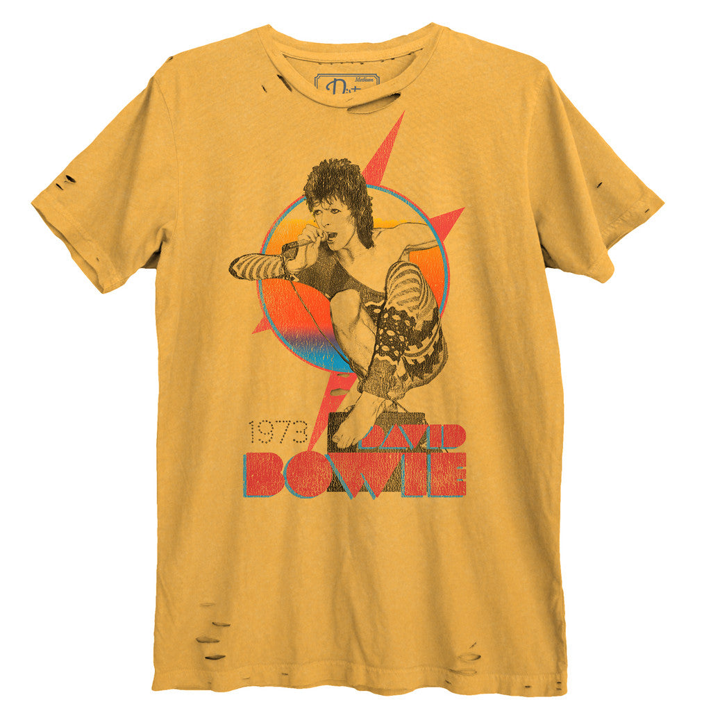 - 100% Cotton- Unisex Destroyed Cut T-Shirt, Pigment Sunset Gold Color, - Officially Licensed David Bowie Apparel