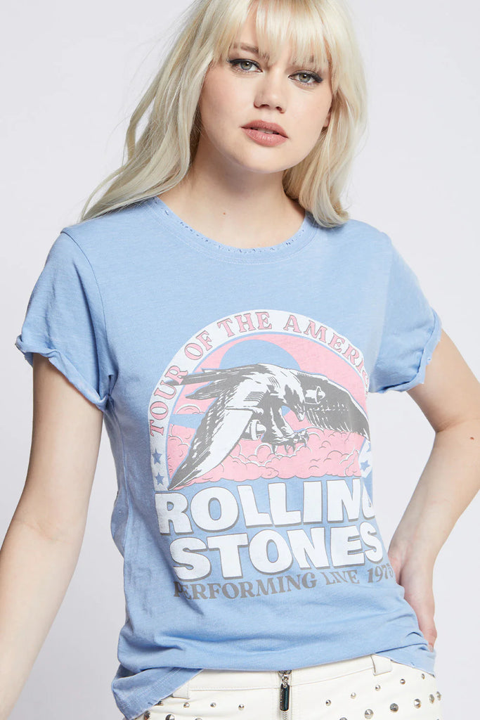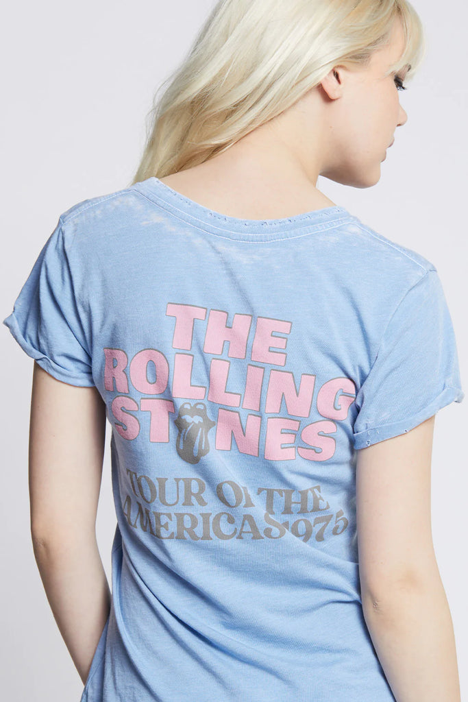 This vintage style Rolling Stones tee features graphics on the front and back from their "Tour Of The Americas" 1975 tour. Made with soft vintage washed fabric, a ribbed crew neckline, distressed hems, rolled sleeves, and a slim it.