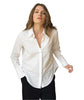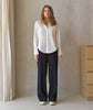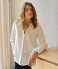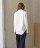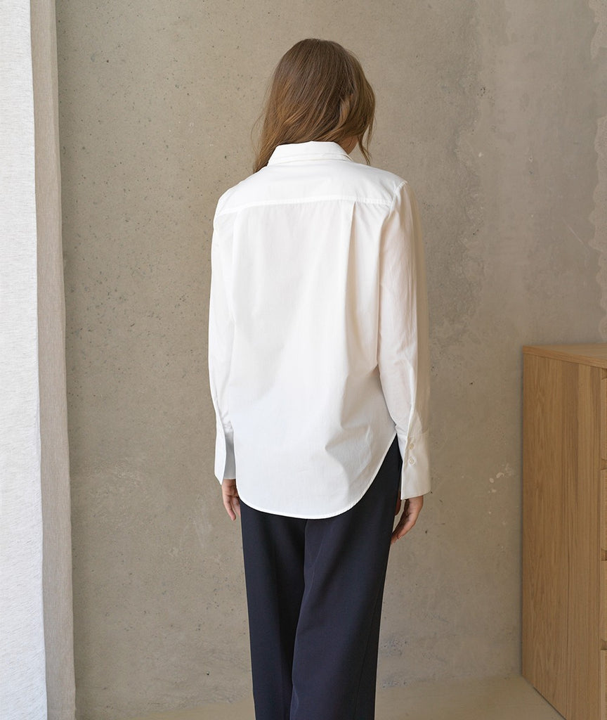 Cotton poplin shirt. Double collar closed by seven natural mother-of-pearl buttons hidden under a button placket. Pleats in the back. Long sleeves, cuffs tightened by two buttons. Rounded base split on the sides.
