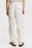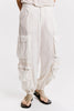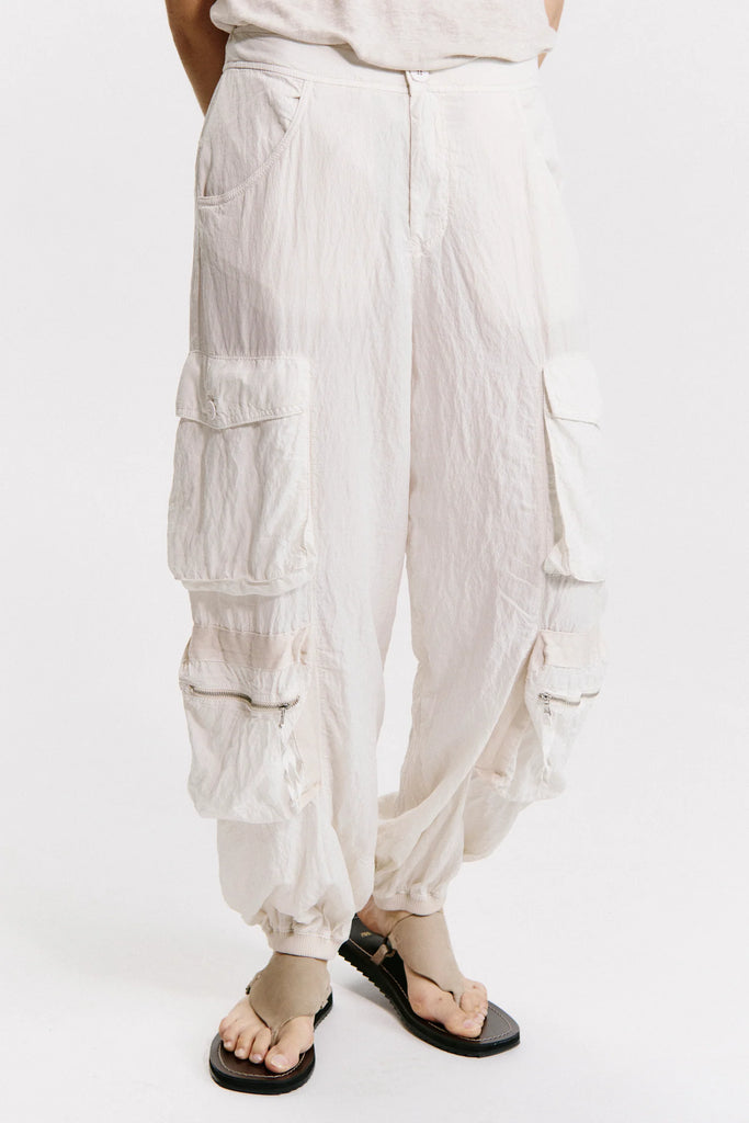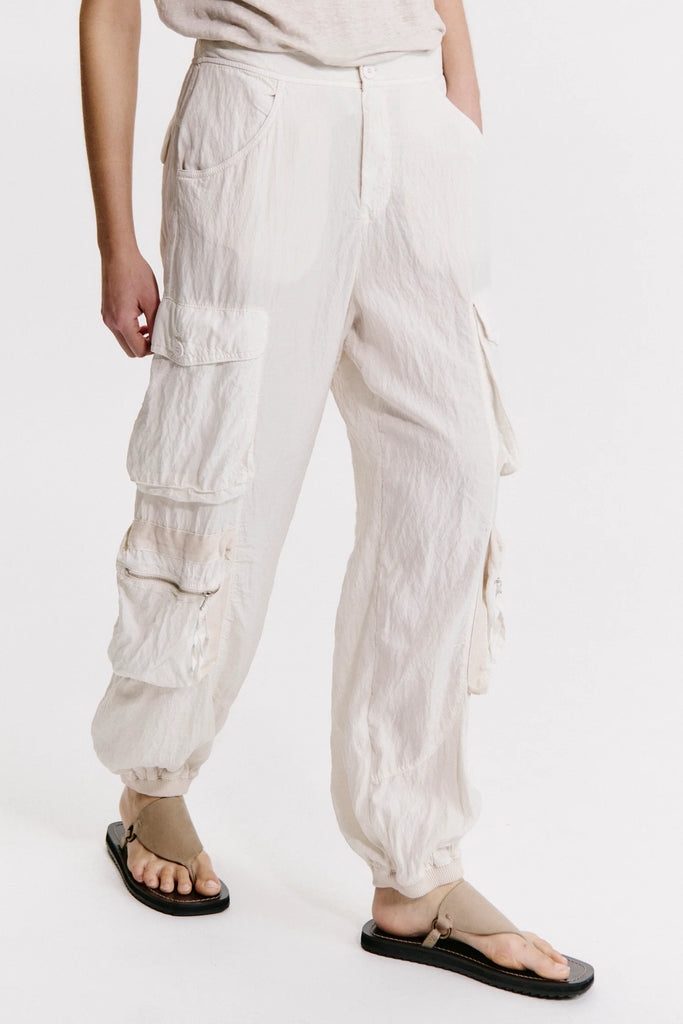 Silk-blend cargo trousers with rounded pockets at the top and additional patch pockets on the sides. On the thighs, there are square accordion pockets with flaps. The zip-fastened pockets on the calves have tape trims. The waistband is elasticated at the back and there is a ribbed knit trim on the hems. There are two flaps at the back. Garment dyed.