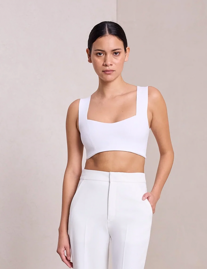 Rendered in the signature compact knit yarn and featuring a subtle sweetheart neckline and thick shoulder straps.