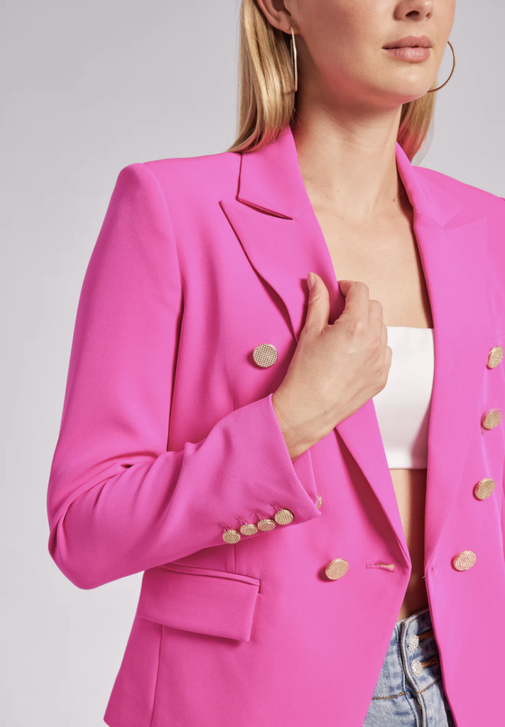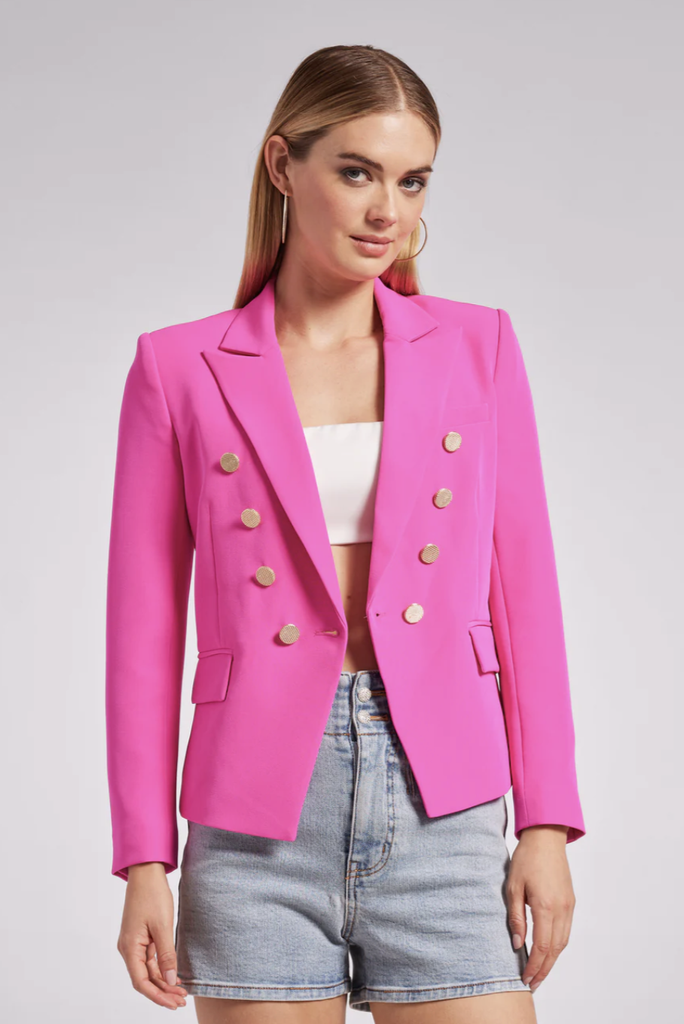 Meet your new favorite blazer. Crafted with crisp crepe, chic gold buttons and a timeless double-breasted design, the Amelia is a classic piece that's a must-have for any day of the week. Style with a button-up and slacks for the office or a cropped tee and jeans for brunch.