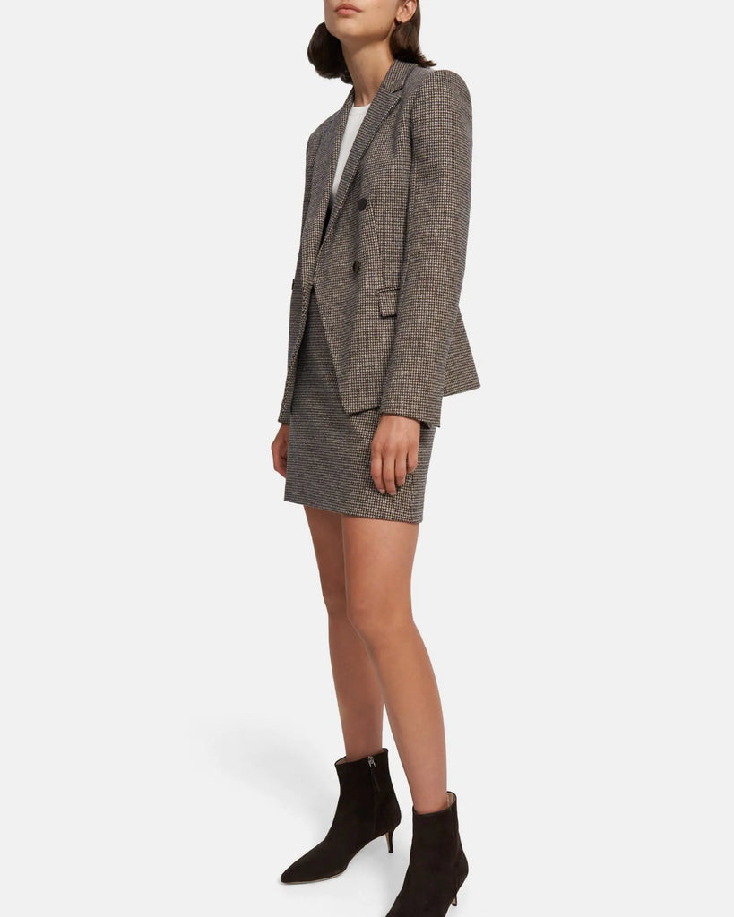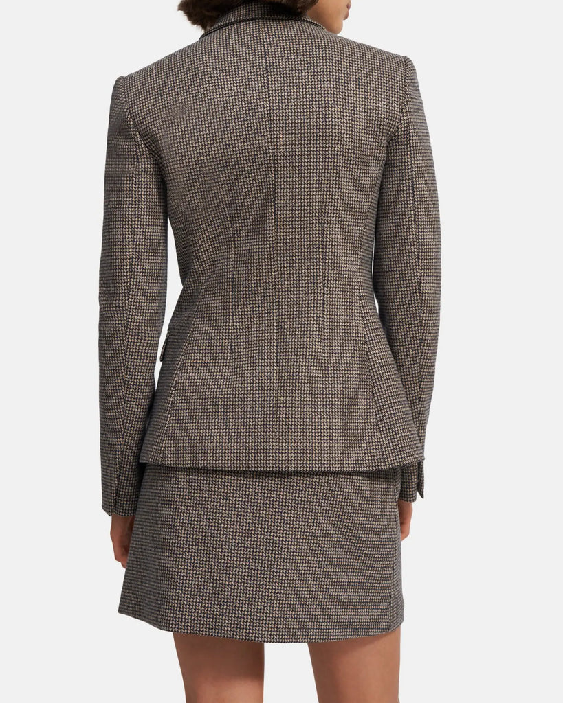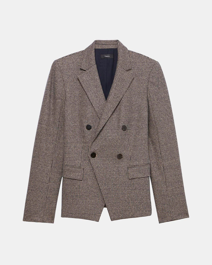 This double-breasted blazer is meticulously tailored with a cutaway front, notch lapels, and structured shoulders. It’s constructed from a refined stretch-wool blend that’s knit with a sophisticated houndstooth design and sourced from Italy.