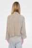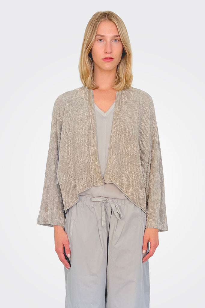 Featuring a soft lapel and a fluid silhouette, it drapes effortlessly for a flattering, relaxed fit. The richly textured fabric is brushed with painterly hues of yellow and blue, offering a unique, wearable statement piece