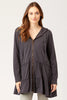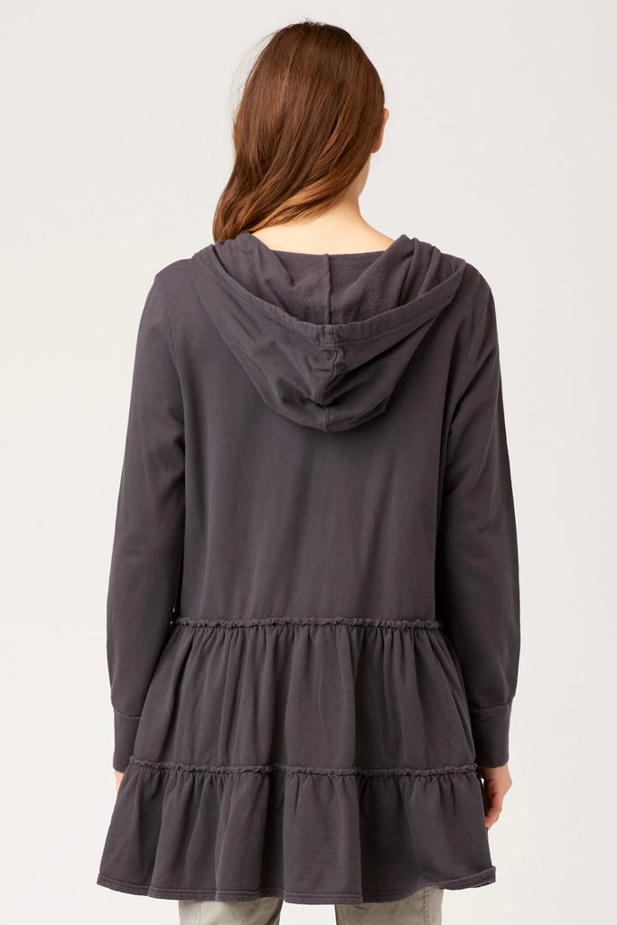 This fleece baby-doll shaped jacket features double ended zip front, hood with drawstring, long sleeves with a cuff, and two valances at hemline.