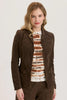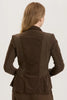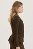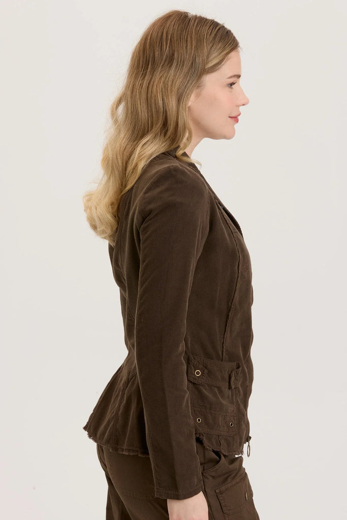 Hardware and raw edges are highlighted in our Raphael Blazer. Fabric mixed contrasting panels, eyelets along pocket edges and brass ring snaps are just a few of the details thorughout this interesting jacket.