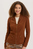 Hardware and raw edges are highlighted in our Raphael Blazer. Fabric mixed contrasting panels, eyelets along pocket edges and brass ring snaps are just a few of the details thorughout this interesting jacket.
