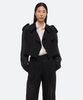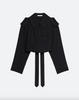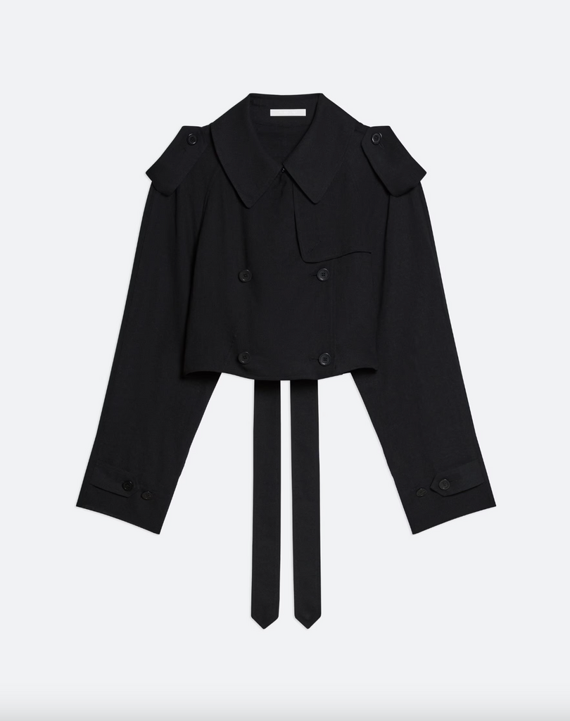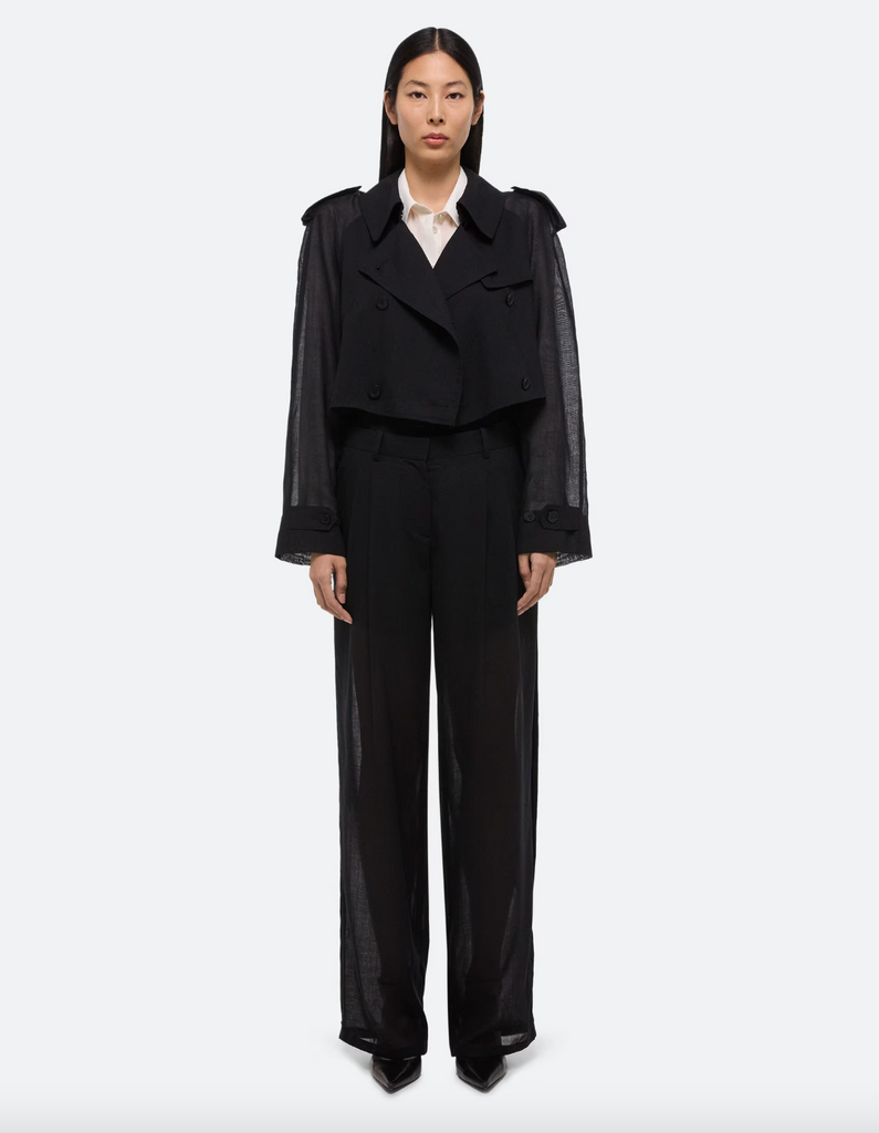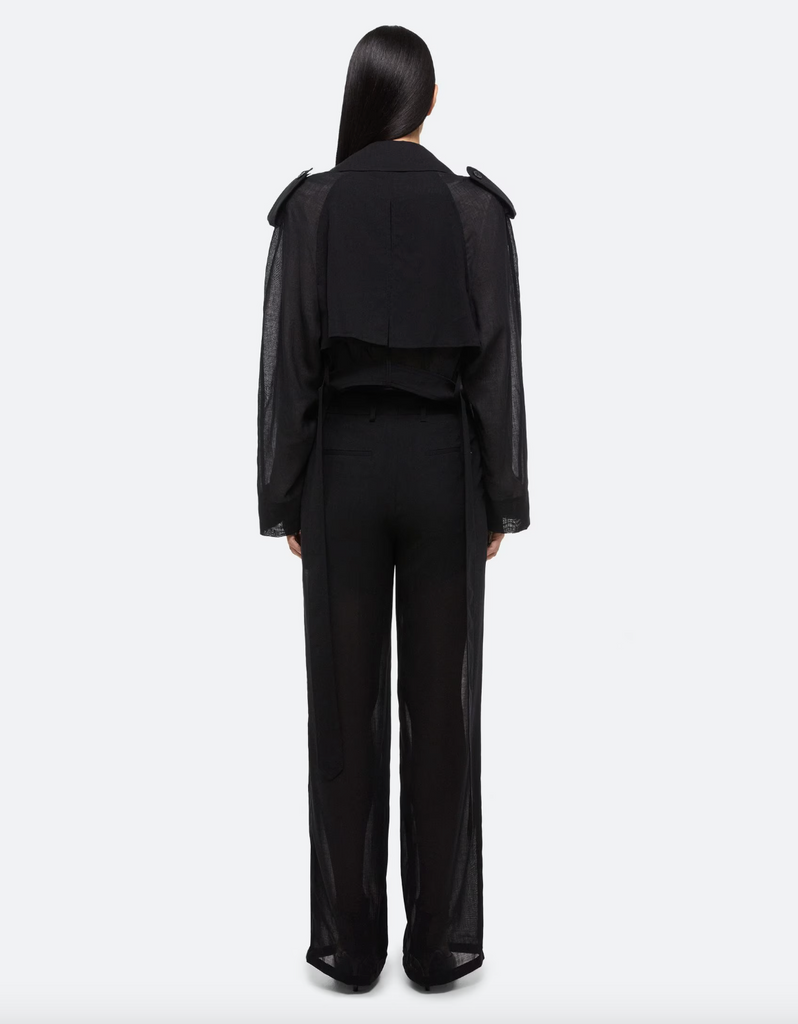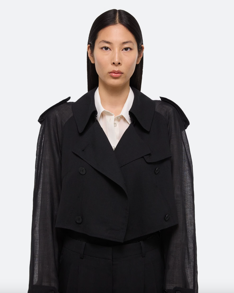 Double-breasted trench jacket with sheer sleeves and a cropped fit. Classic trench details like oversized lapels and epaulets at the shoulder.