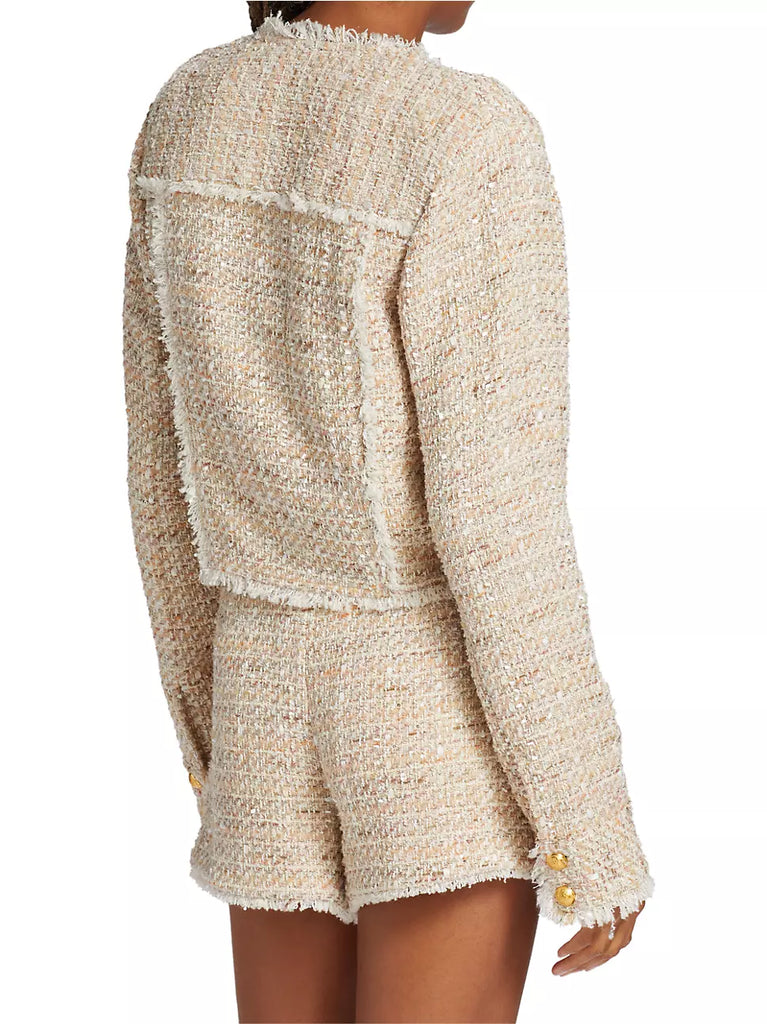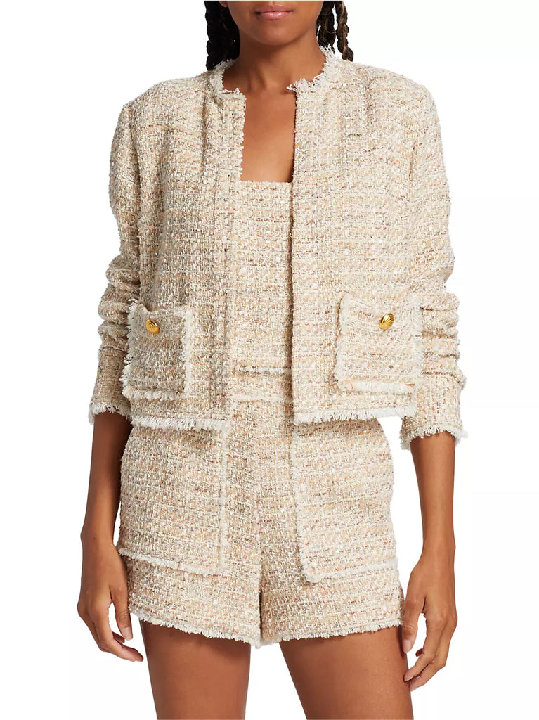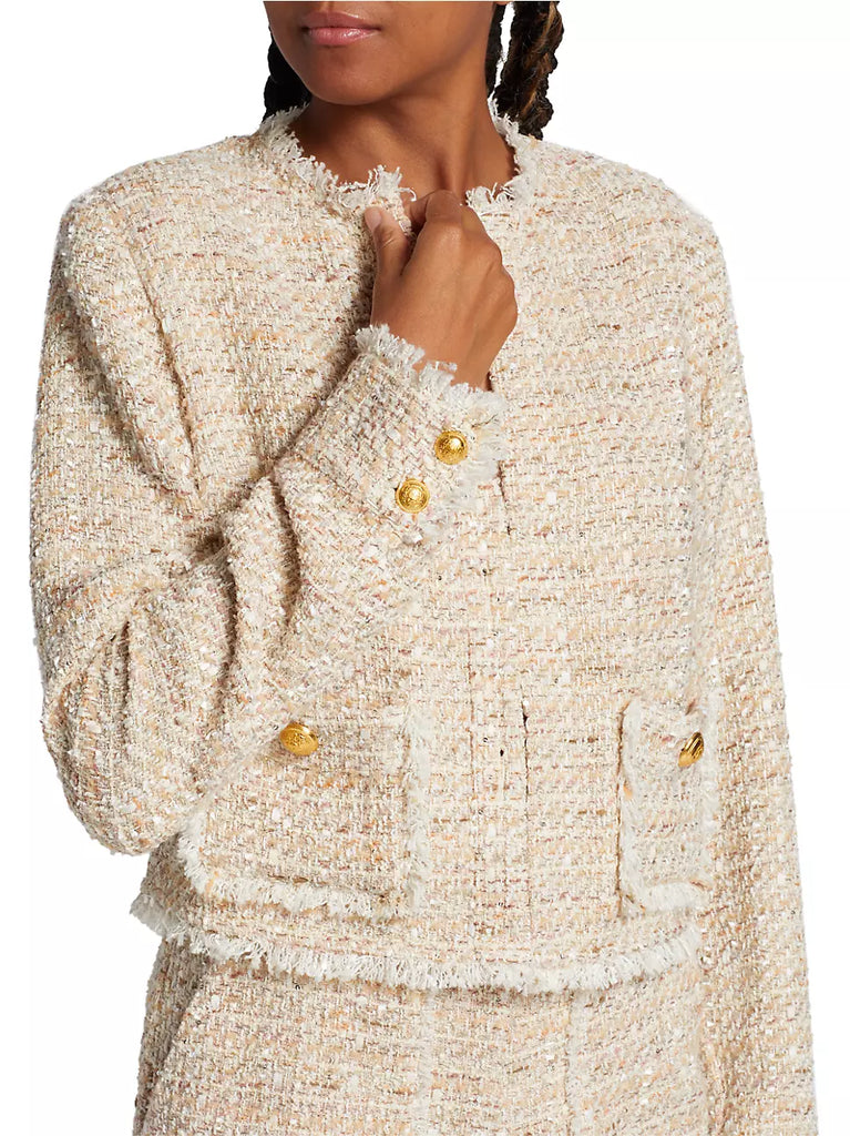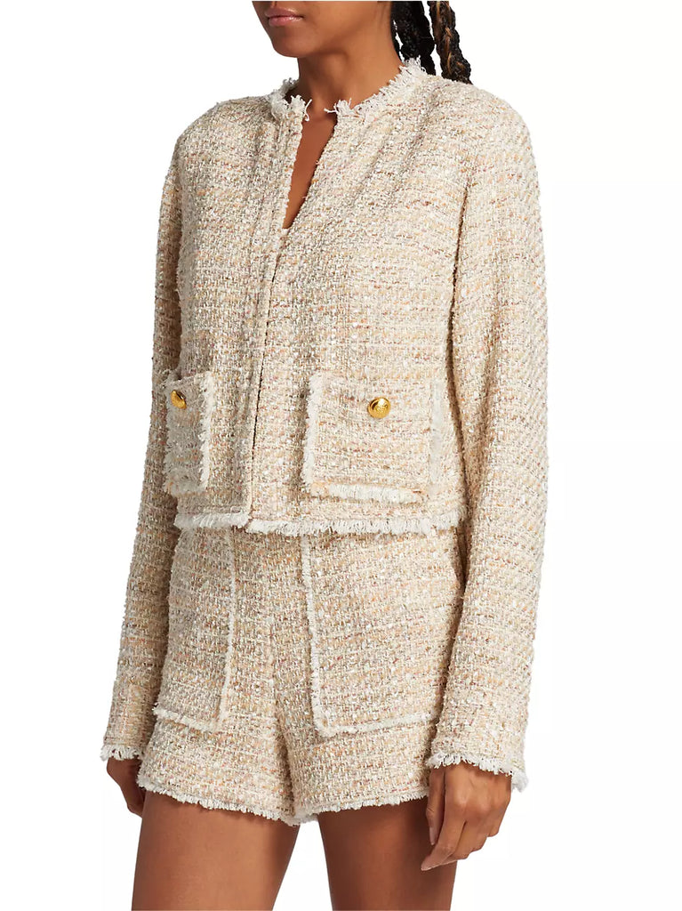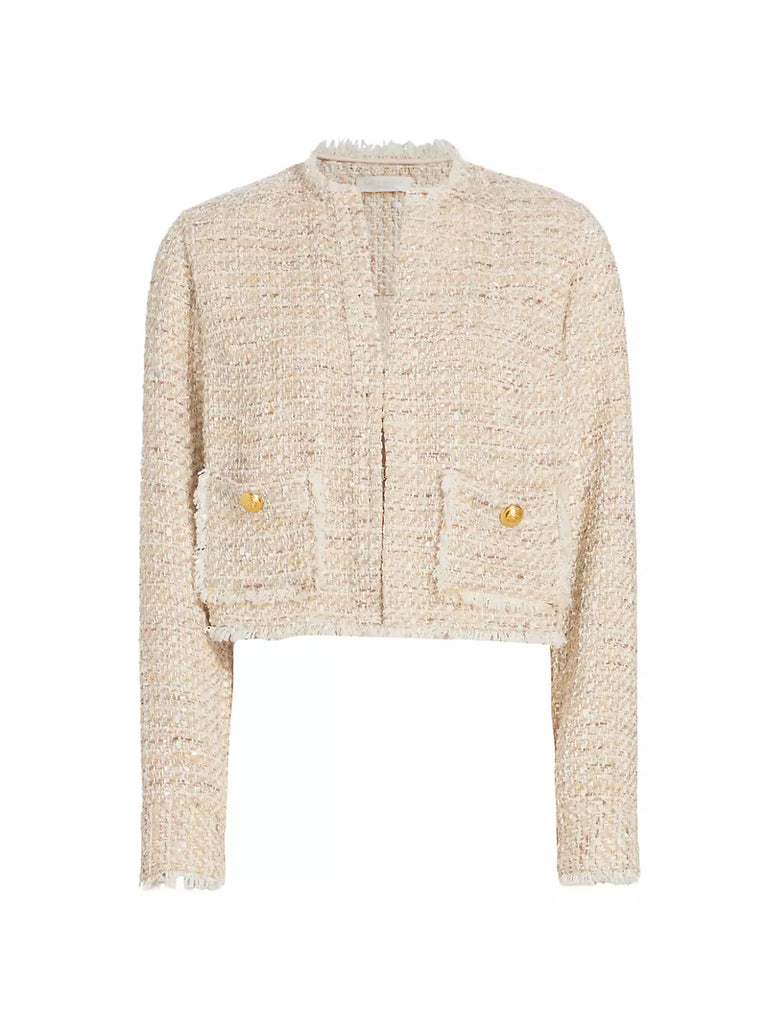 Ramy Brook's Diaz tweed jacket is finished with fringe trim. Tailored with patch pockets, this piece features goldtone buttons.
