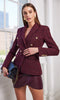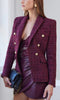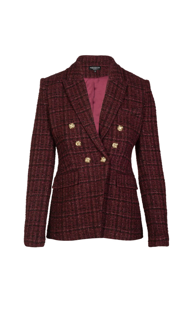 Tailored to turn heads, the Emilio Blazer is a standout in structured sophistication. This double-breasted jacket is crafted from luxe Lurex-mixed tweed in a rich Malbec plaid and finished with gold buttons and flap pockets. Designed with a contoured waist for a feminine silhouette, it pairs perfectly with the matching Kendra Skirt or Quinn Vestier for an elevated head-to-toe moment.