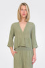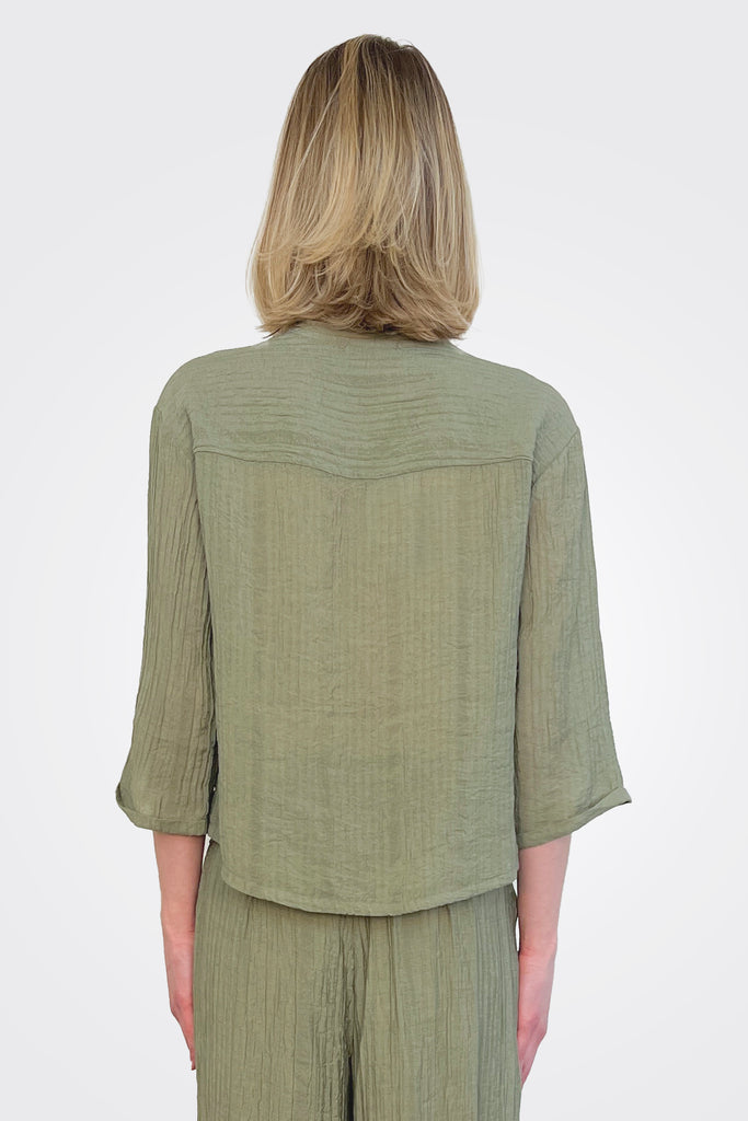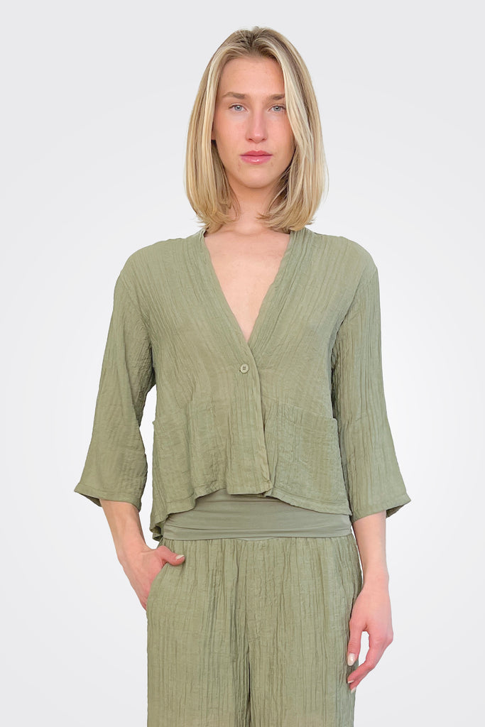Unlined, half-sleeved V-neck jacket in viscose blend textured fabric. 2 patch pockets and 1 button. Head dyed.