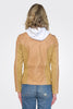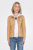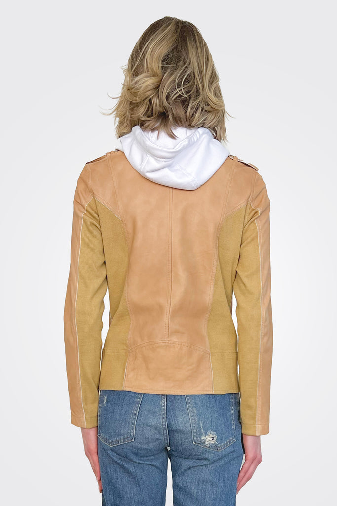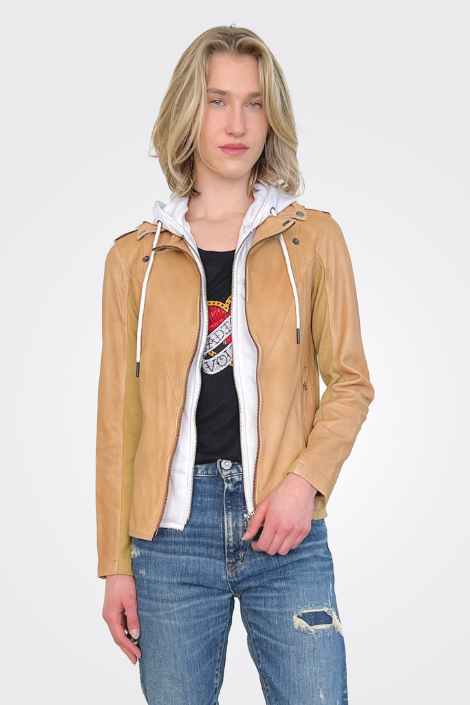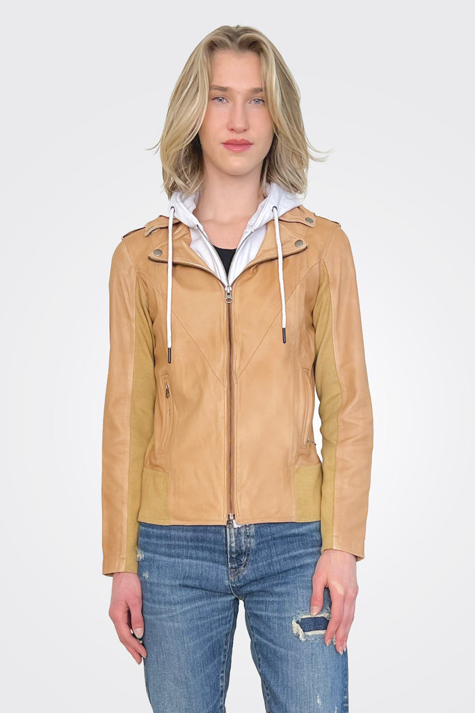 MATERIAL: 100% Leather with french terry hood and zip front.
