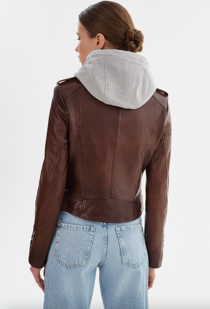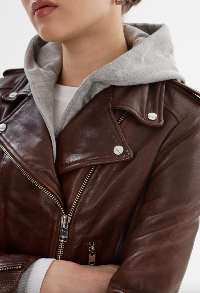 Step out in the iconic fit that refuses to go out of style. Complete with a fall-ready removable hood, the Holy leather jacket brings a feminine touch to the edgy biker aesthetic. Featuring an asymmetrical closure, a wide collar with crips silver snaps, and a buttery-soft lamb's leather body, this versatile stunner knows no limits. Opt for the gorgeously unique biker jacket that only gets more alluring over time.