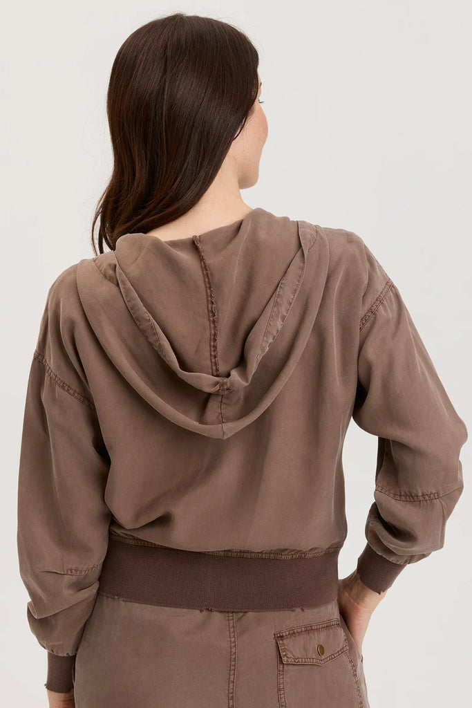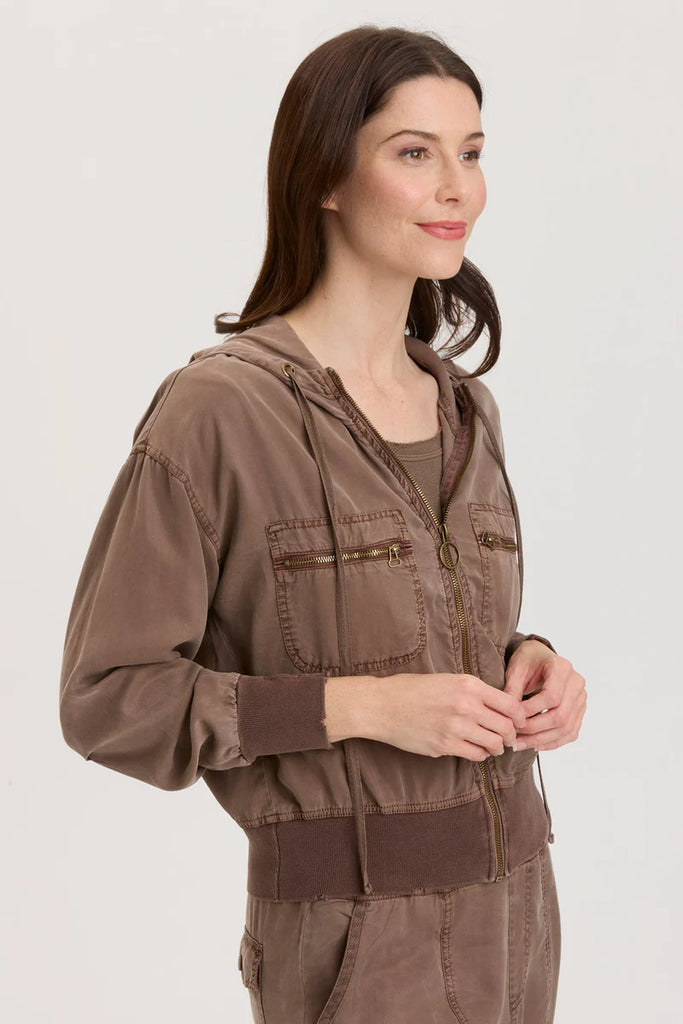 A banded distressed rib bottom and cuffs is just the beginning of this sporty number. With front zip pockets, a ring-pull zipper and a hood, Karney combines traditional bomber flair with comfort and class.