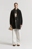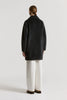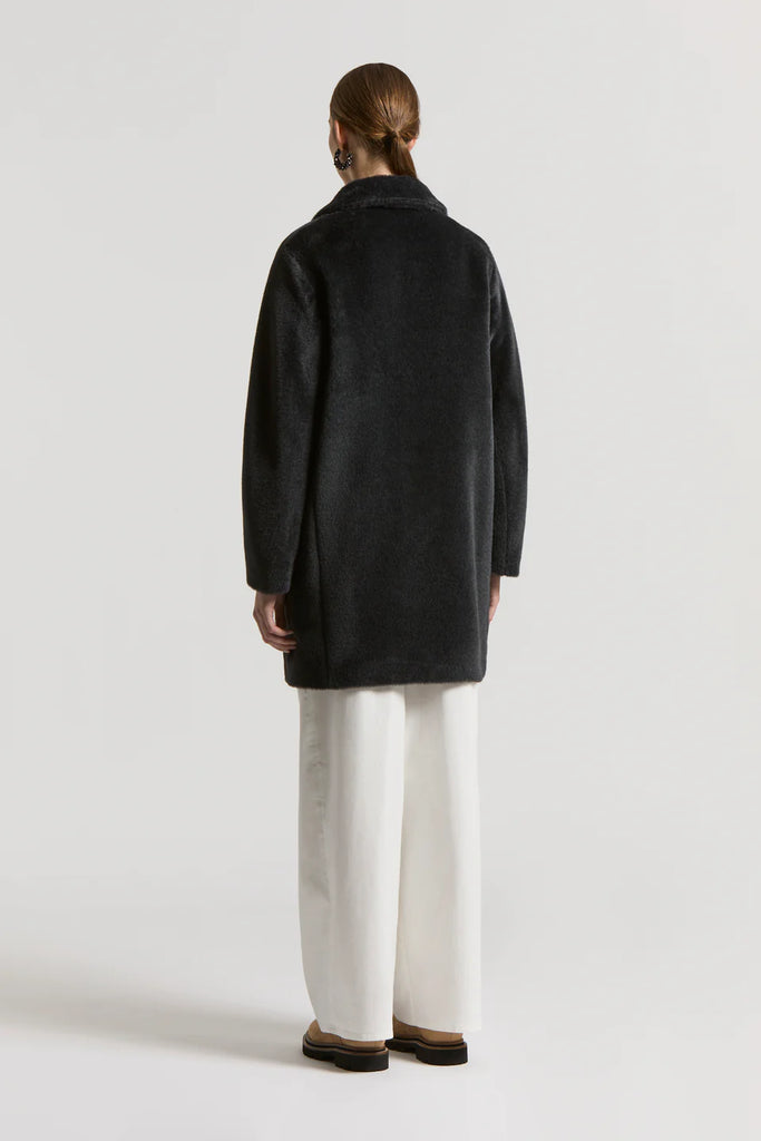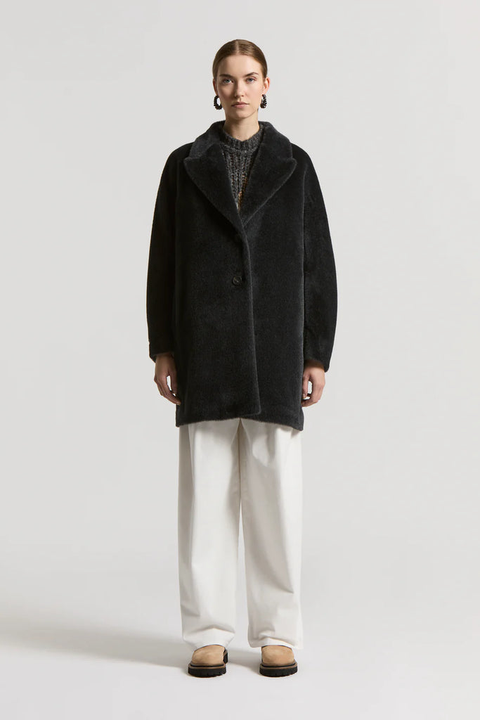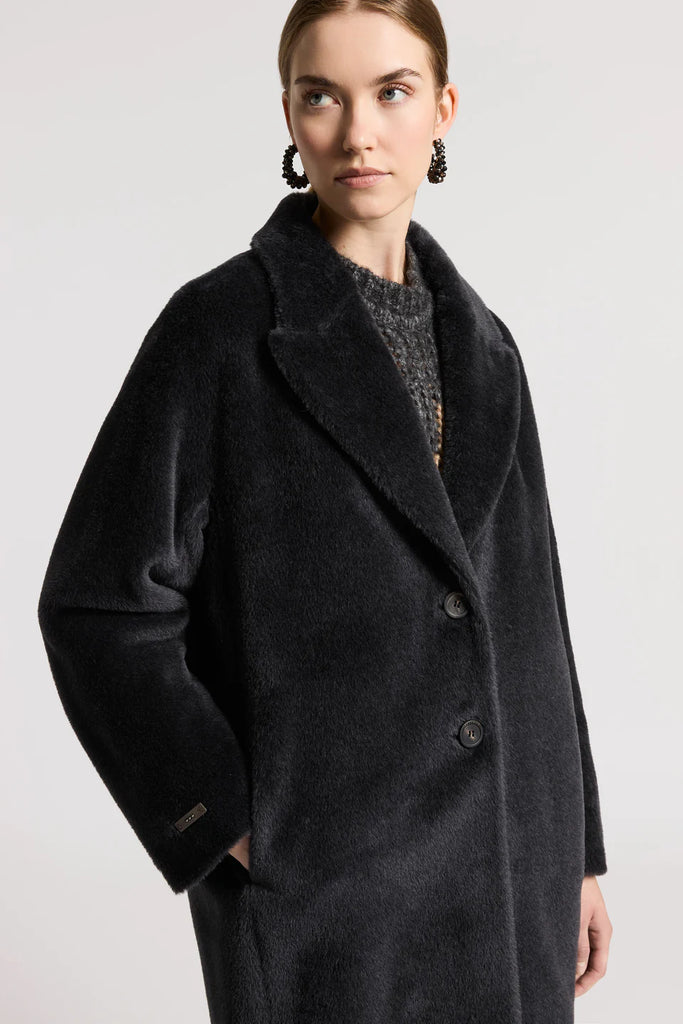 This dark grey long-haired alpaca velour coat is a timeless classic, presented in this new model with a slightly egg-shaped line.