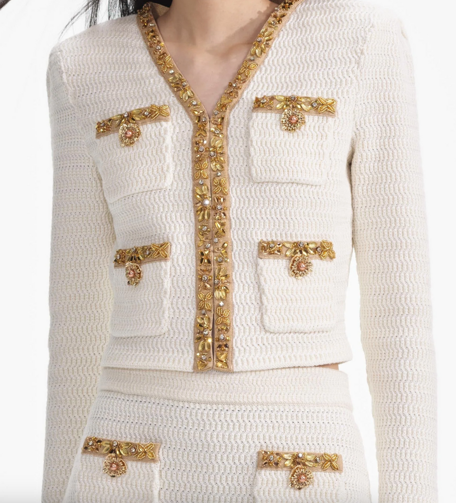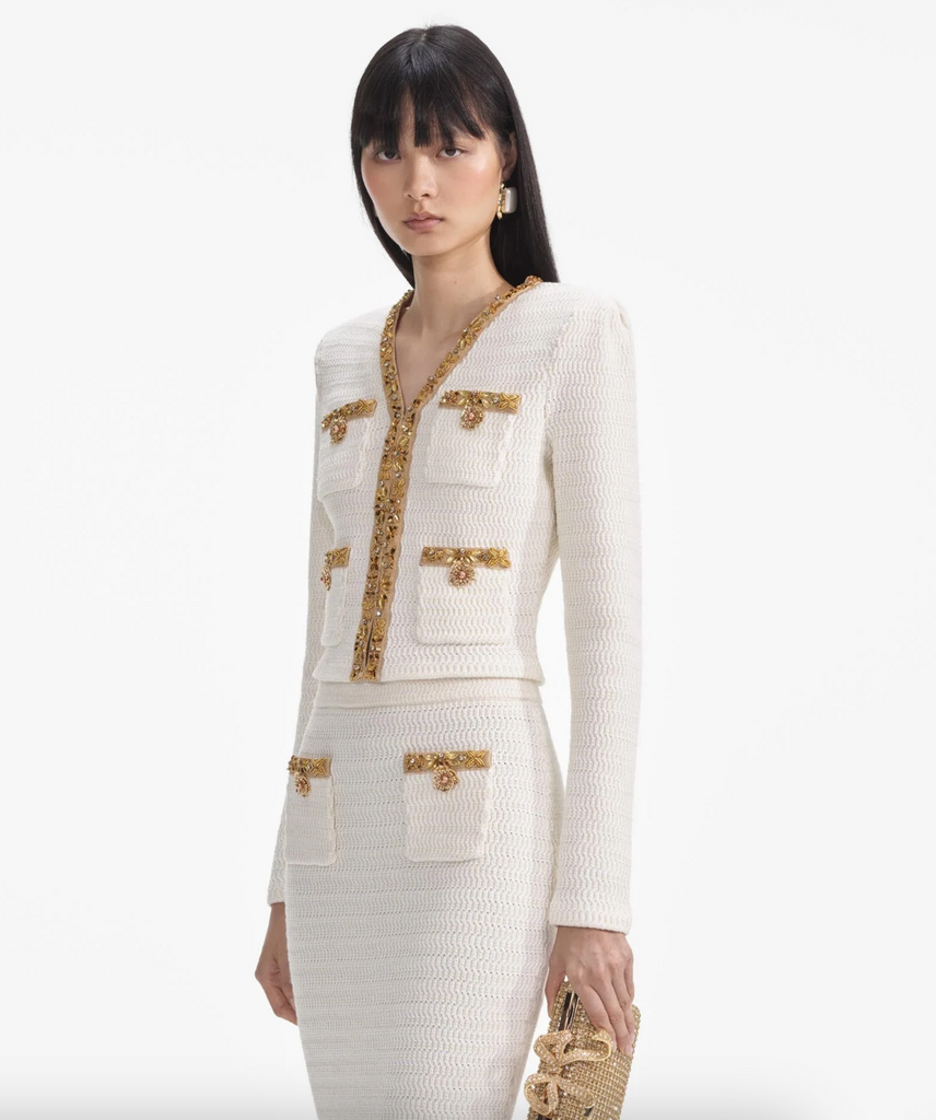 Knitted with lurex for a sculpted fit and metallic finish, this cardigan boasts a timeless white-gold palette. Add our statement jewellery to make it a chic centrepiece for every festive look.
