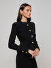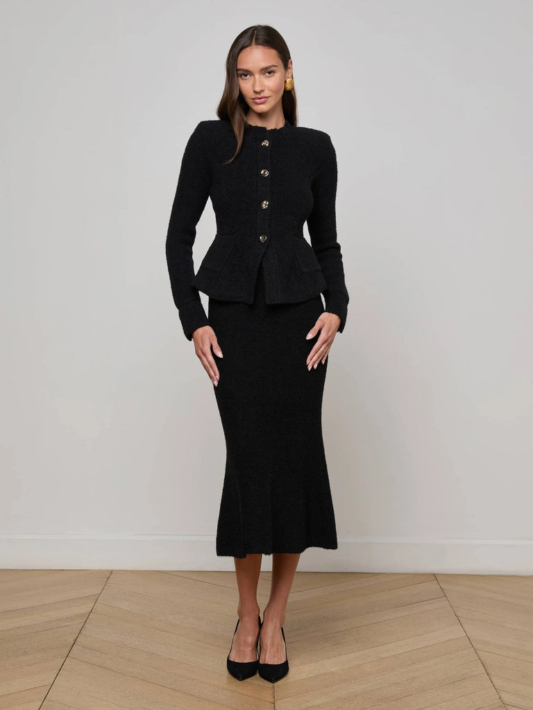 The Melissa cardigan blends soft structure with quiet elegance. Spun in a textured knit, it’s shaped with a sculpted waist and flared hem that flatters the figure. A clean neckline and graceful silhouette channels elegance with a hint of old-world charm while novel accent buttons keep it thoroughly modern. Wear with its coordinating skirt and heels for a polished head-to-toe look.