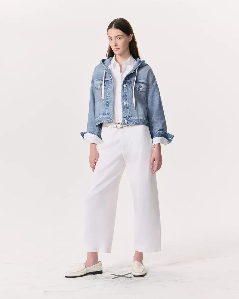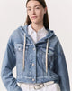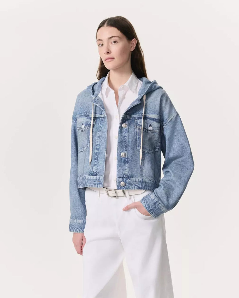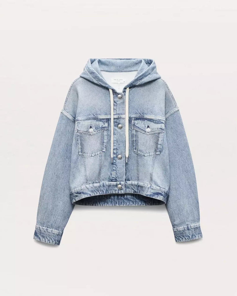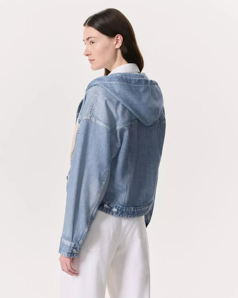 Miramar, our revolutionary printing technique, makes any material look like denim. This cross between a trucker jacket and a hooded sweatshirt is individually cut and sewn from cotton terry cloth that's ultra-soft on the inside and printed on the outside to look like your favorite denim jacket. Featuring functional draw cords, faux chest pockets, and signature dagger buttons down the front and cuffs, the relaxed style further achieves its comfortable fit and feel with the other pockets and denim details digitally printed on the fabric.