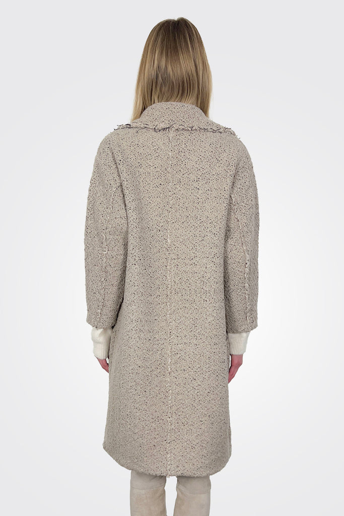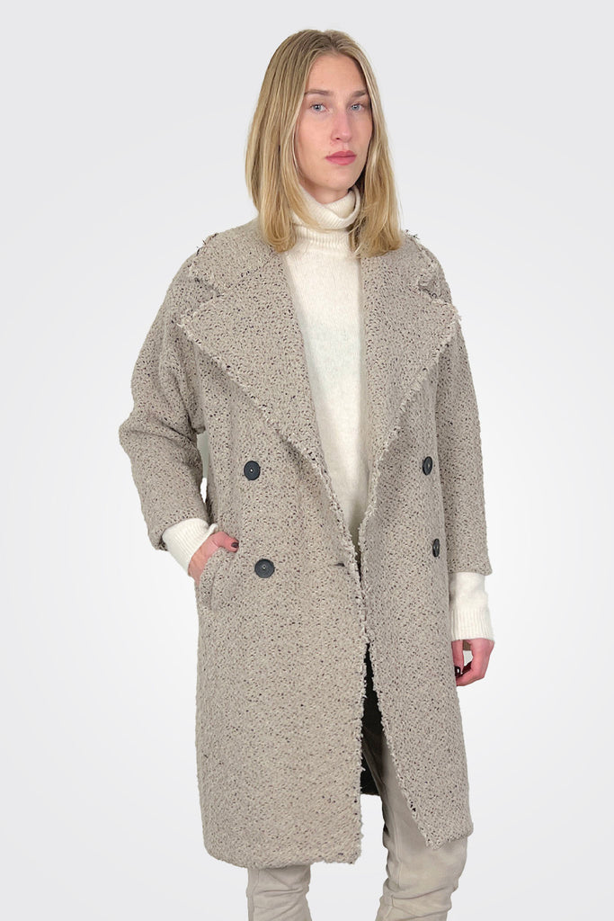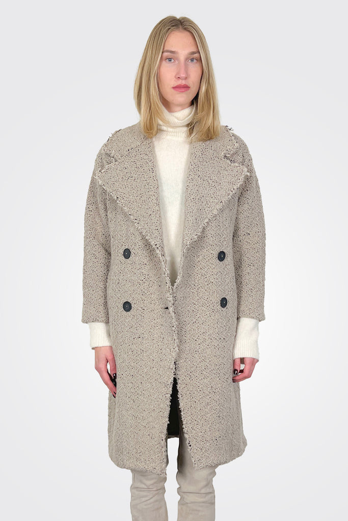Lined, double-breasted oversized coat, made of heavy wool bouclé knit. The garment features a wide lapel collar, four buttons, and two front welt pockets. The fabric edges are raw, leaving the frayed edge finished with two stitching stitches.
