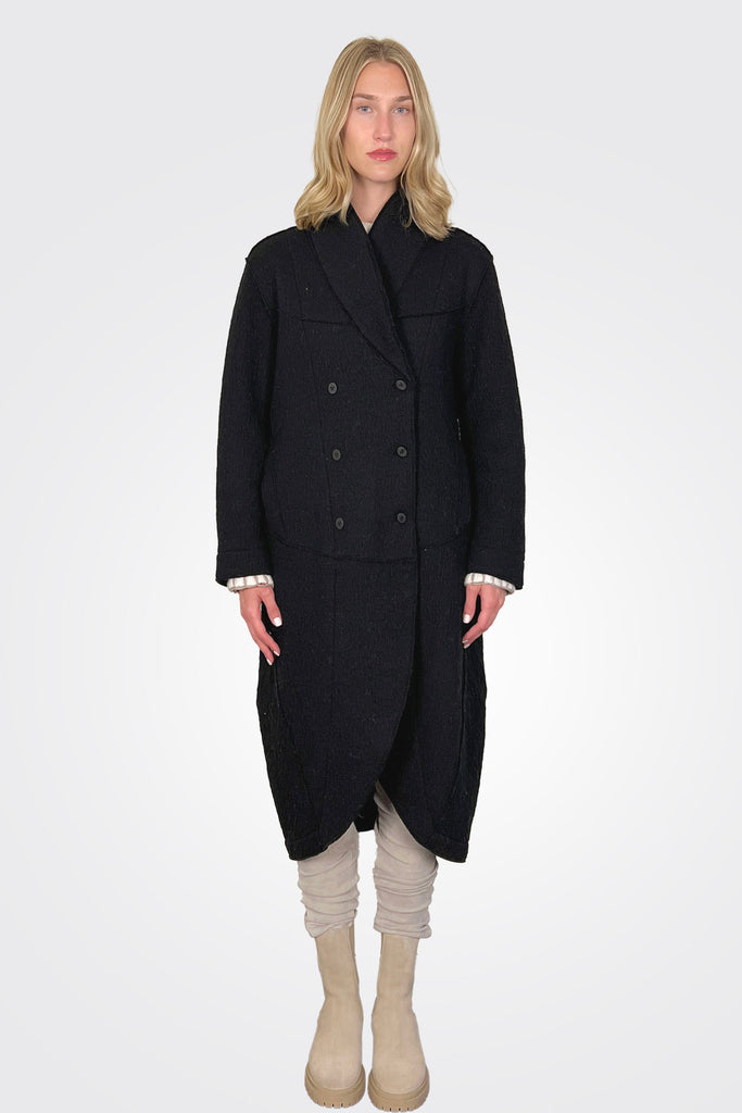 Oversized coat with button enclosure. Makeshift lapel with rounded hem