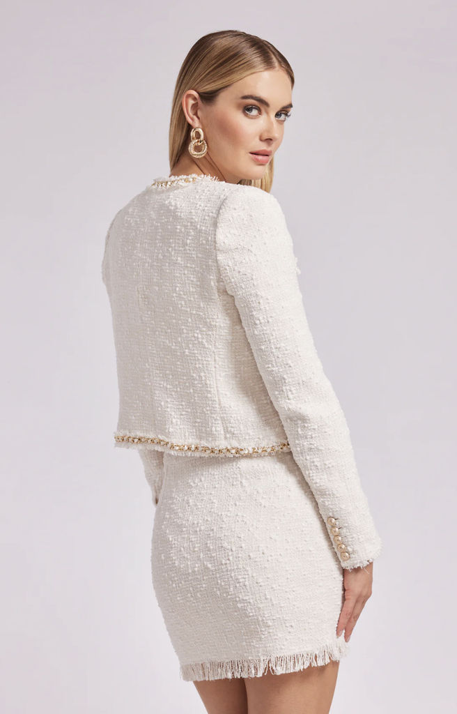 Transform into the most glam boss in the Serena. With classic tweed elevated by luxe leather chain trim, this jacket is the perfect mix of modern and timeless style. You'll be best dressed at happy hour when you pair this layer with a crisp button-up and trousers. Generation Love’s tweed is crafted with recycled fabric.